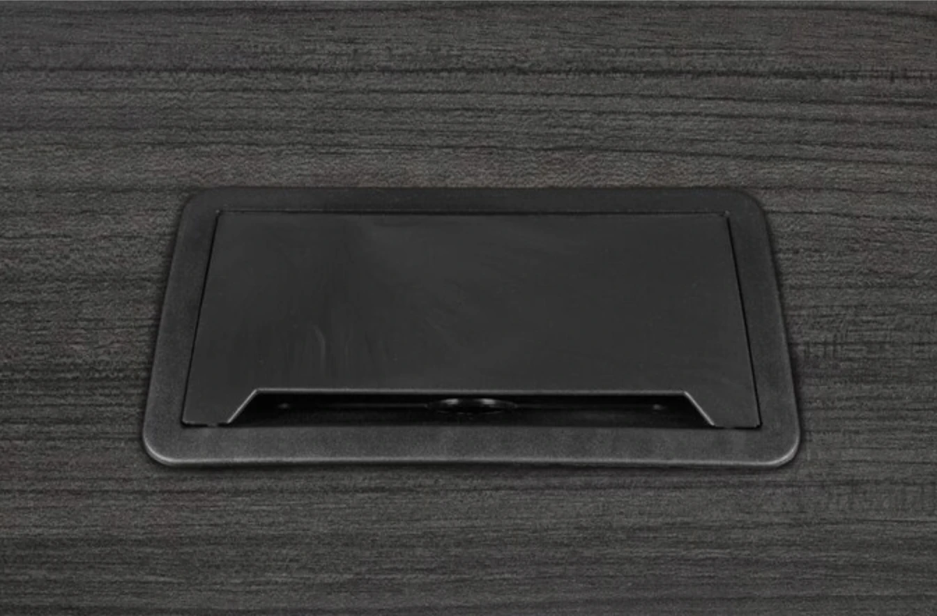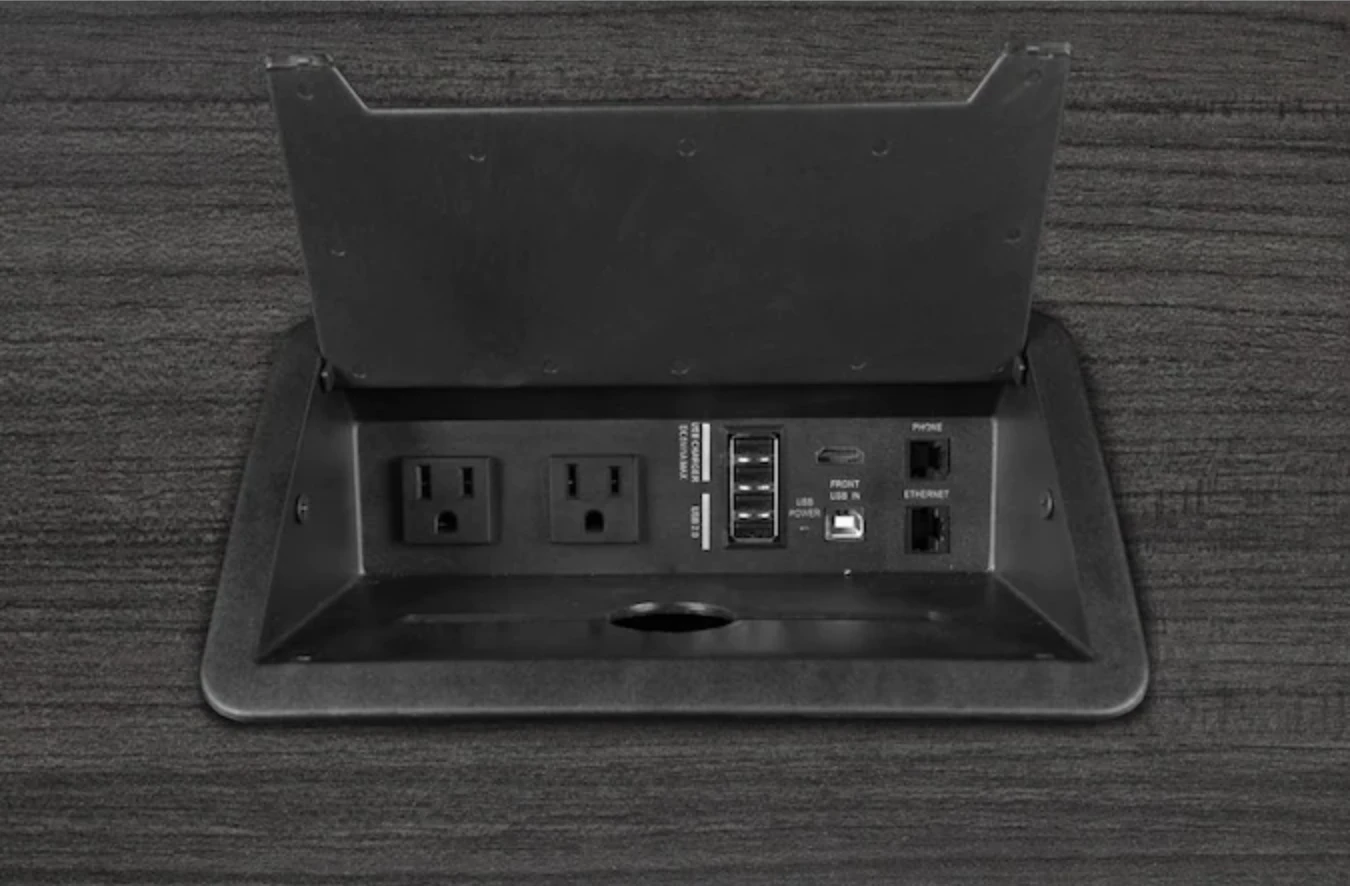 This beautiful conference table from Regency features premium commercial-grade edging, a smooth ash gray finish, a central power/data port, and more. The power/data port includes (2) USB 2.0 ports, (2) USB charging ports, (2) AC 125V 60Hz outlets, (1) front/rear ethernet port, (1) front/rear phone port and has a black cover plate for a neat, clean look. The tabletop is a 1-inch thick thermal fused melamine laminate, meaning that it will resist stains, scratches, and burns to the surface; retaining the same clean finish for the long haul. It also offers a modular design, so that if you want to add on and make the table longer down the line, you can. It is backed by Regency’s 10-year warranty as well!