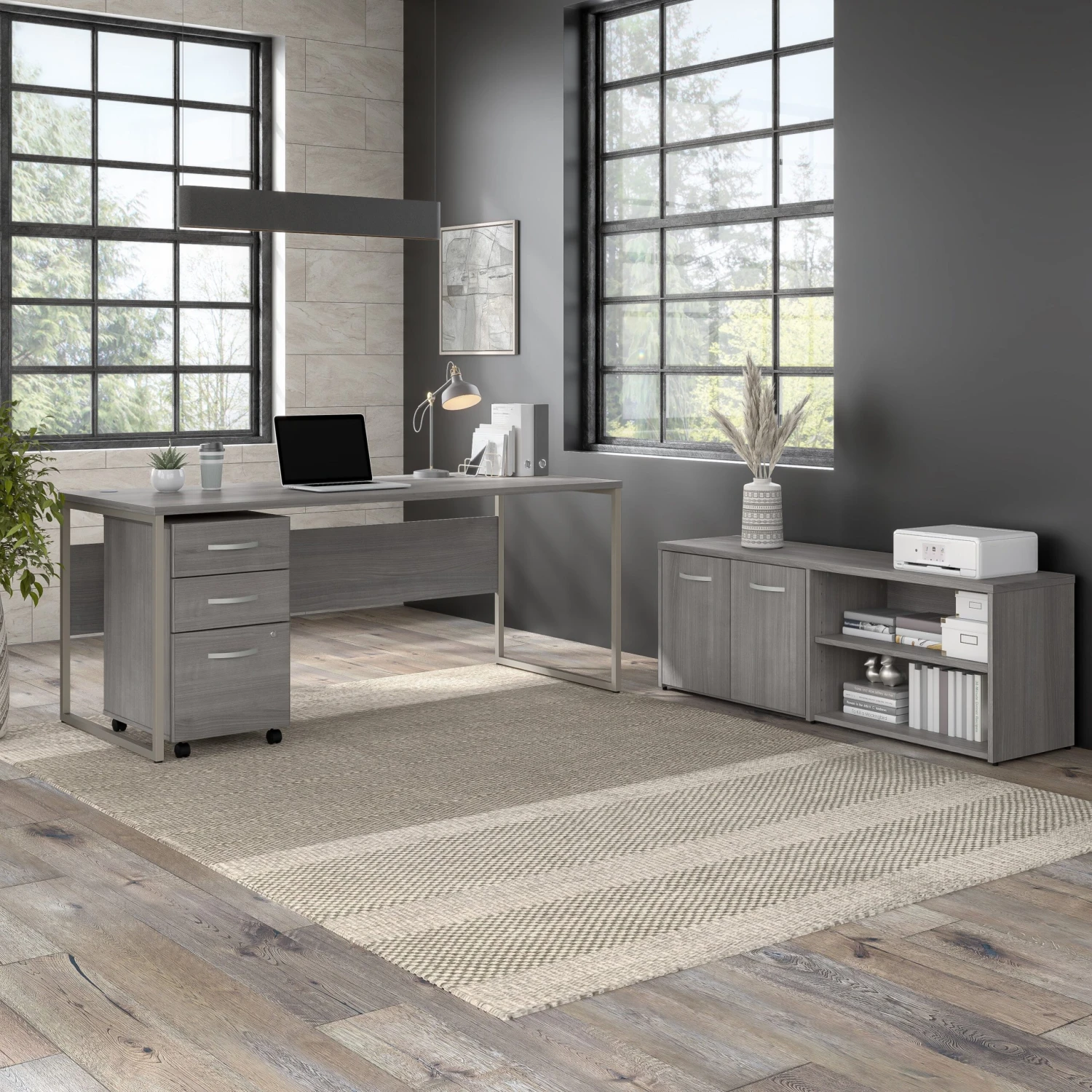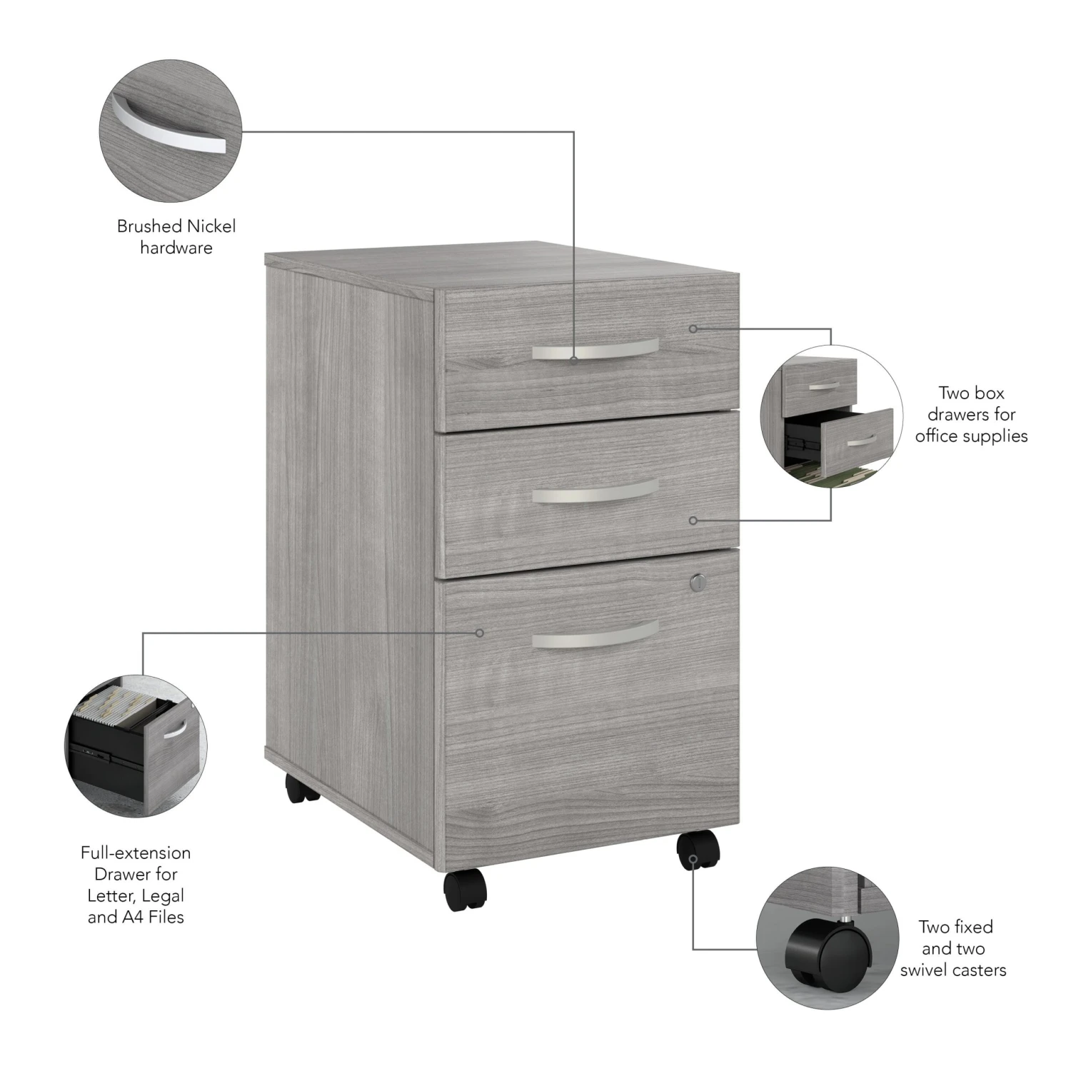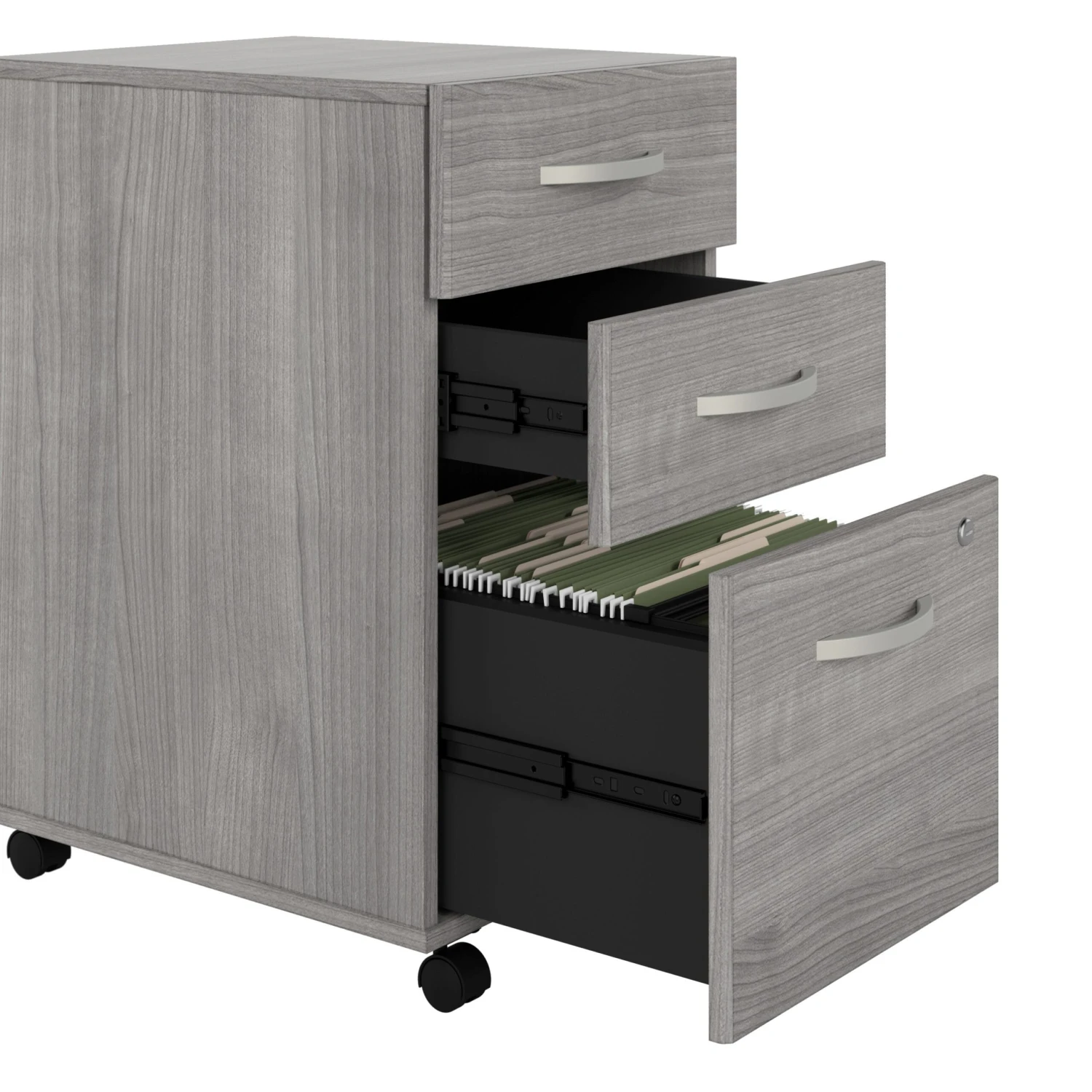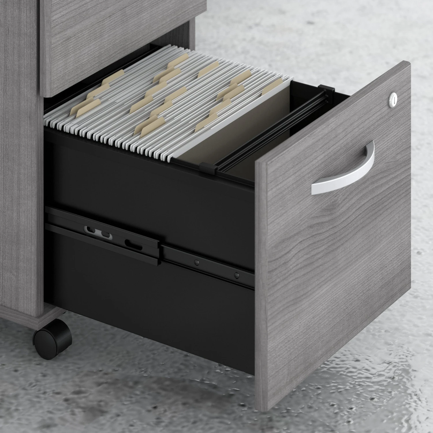 This 3-drawer pre-assembled file cabinet from premium manufacturer BBF offers an elegant appearance and practical, spacious storage for the modern professional. The platinum gray finish adds a sleek tone that gives a fresh feel, and is ready to immediately liven up your office or home thanks to the file cabinet being pre-assembled. The bottom lockable full-extension file drawer opens on smooth ball-bearing slides and securely stores all of your letter-size documents. The two box drawers, the bottom one being lockable by the same single lock on the file drawer, provide ample space for office supplies and belongings. The compact design allows it to fit beneath the desk, or rolls easily for convenient mobility and access. A 3-year manufacturer warranty is included for your peace of mind.ย