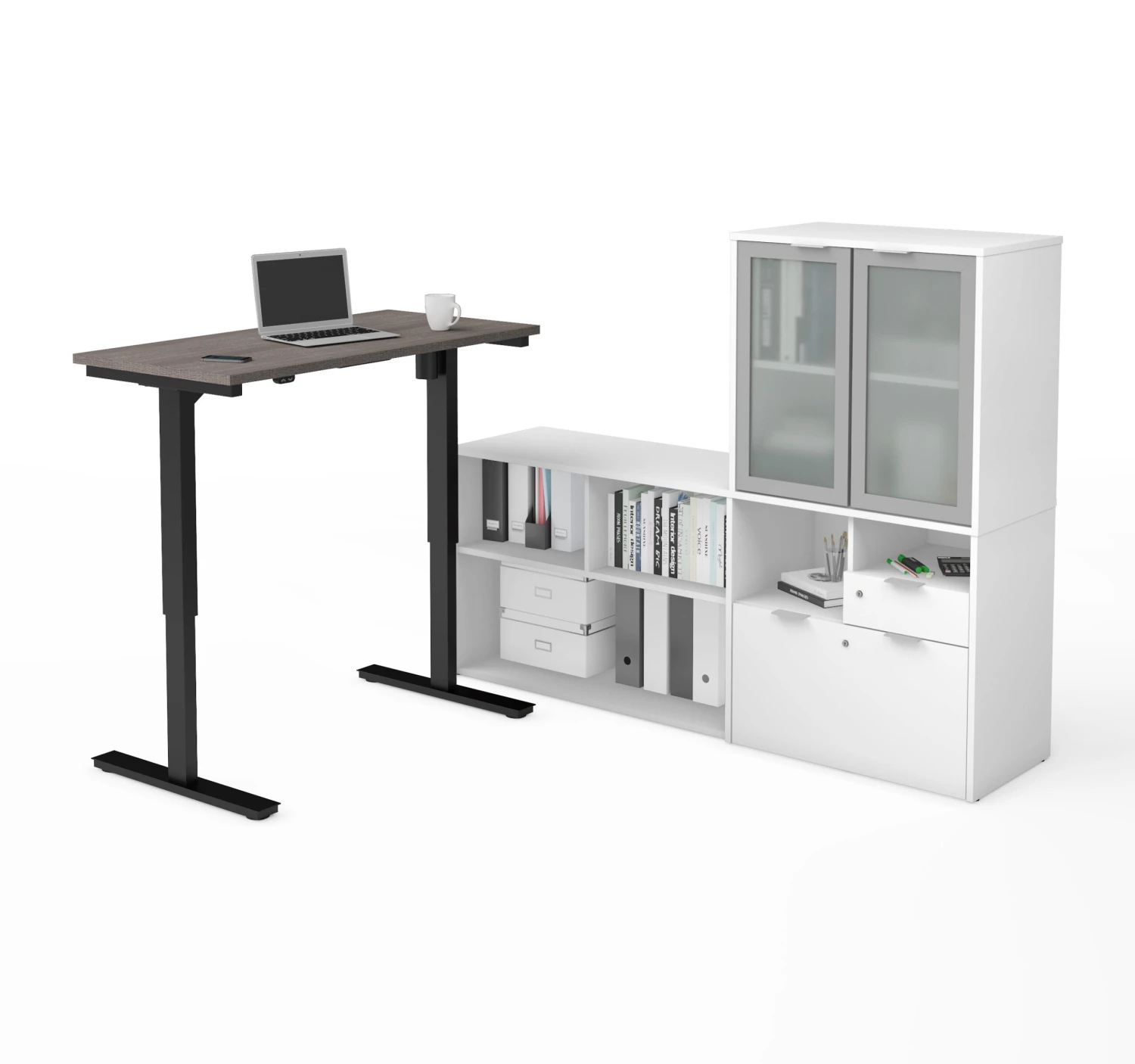 The first piece of this versatile desk set is an adjustable standing desk in a professional bark gray finish, perfect for fluctuating office needs. The second piece is a white credenza with five open storage cubbies, a locking file drawer, and a locking supply drawer, topped by a hutch with frosted glass and two adjustable shelves. Store your printer or scanner on the credenza while using the desk surface elsewhere in the office! Backed by Bestar’s 10-year warranty and melamine coated for protection against wear and scratches. Need even more storage than this desk offers? Add on the optional matching lateral file and bookcase.