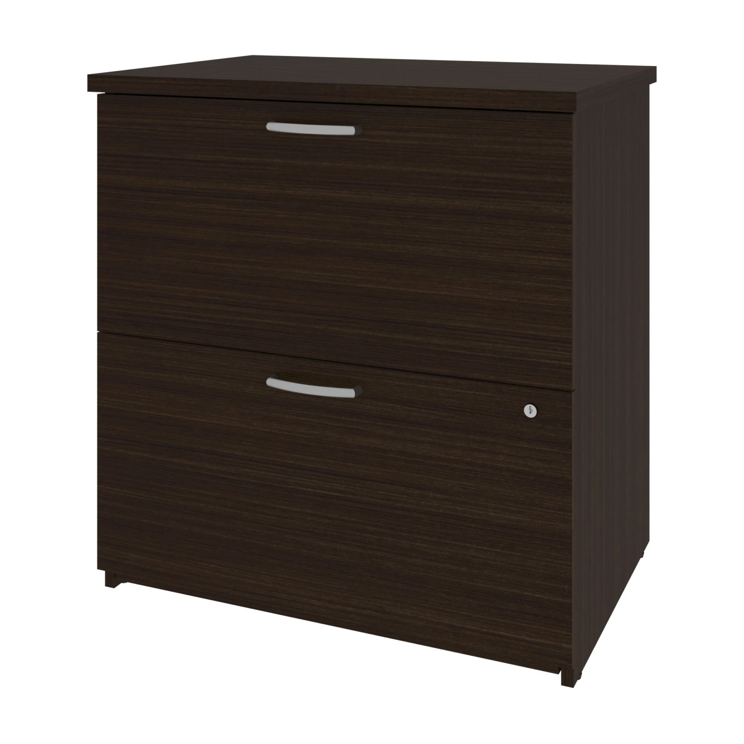 Petite and designed for any office, this file cabinet offers a slender frame for effortless storage. With a discreet lock, it holds two secure file drawers. The top is still large enough to hold a printer, scanner, or more for easy access in the office. With a luxurious dark chocolate woodgrain finish, it blends effortlessly with a variety of office decor. Delicate brushed silver hardware finishes the look, with looped drawer pulls for a modern design.