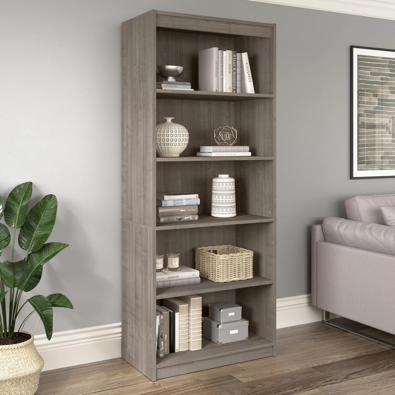 This elegant, simple bookcase holds 5 sturdy shelves for a maximum of storage in your office. In a sleek silver maple woodgrain finish, it blends effortlessly with a variety of office decor. Use the shelves to keep books, binders, photos, or personal items. This bookcase matches perfectly to a variety of silver maple or silver maple & white office furniture.