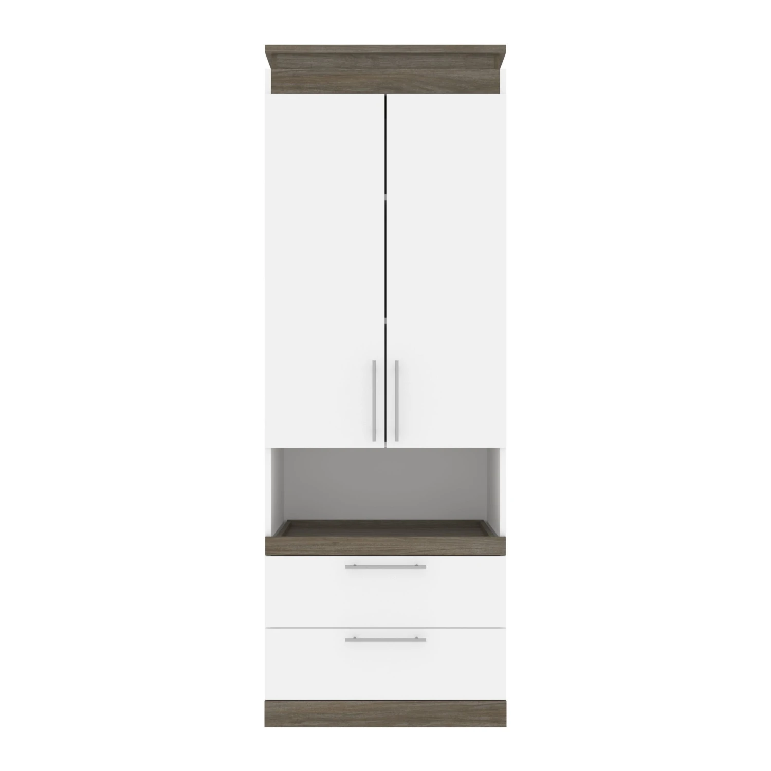 Add an extra dimension of storage to your office with this unique cabinet, incorporating a closed bookcase along with two drawers and an open shelf. In a rich walnut gray and white finish, it will blend with a variety of office decor. Silver hardware finishes the look, and a melamine coating ensures that this cabinet will last for years to come without stains or scratches.