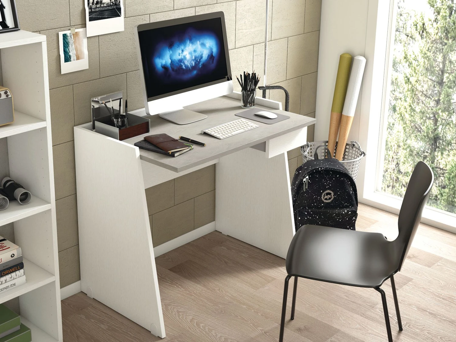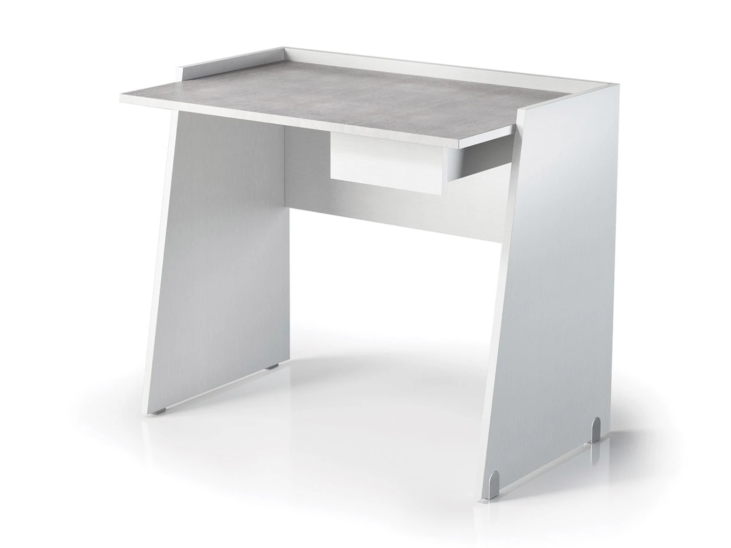 This diminutive desk offers a sturdy workspace, as well as a surprisingly large working surface for any office. A single rolling drawer tucks beneath the top for extra storage, while a raised rim to the desk grants security. The satin white finish on most of the frame contrasts beautifully with a concrete grain finish on the top.