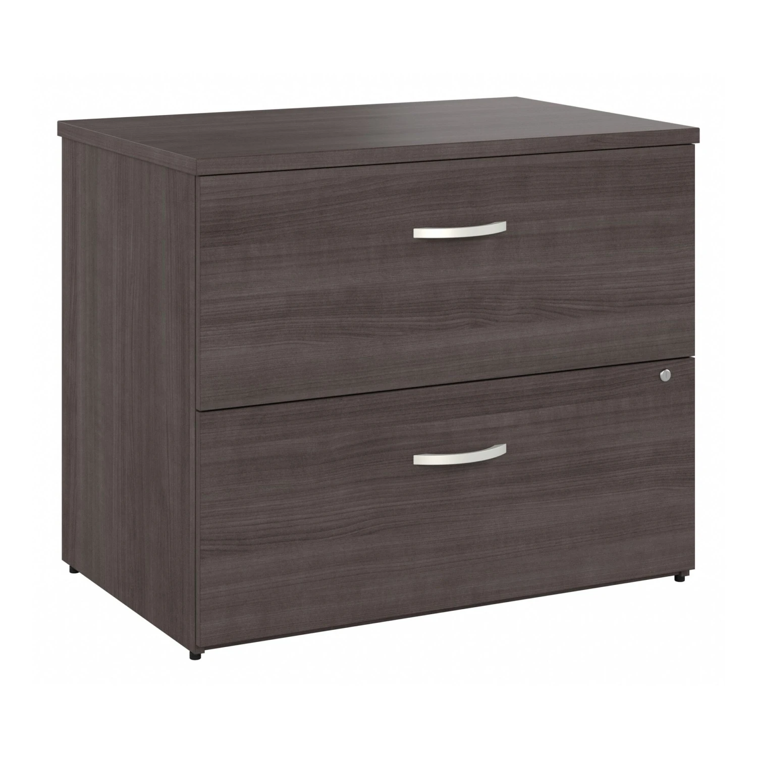 This 2-drawer lateral file cabinet blends contemporary elegance with reliable, spacious storage, ready for immediate use in your office or home as it comes pre-assembled! The storm gray finish has a sleek but subtle appearance, adding a hint of modern style that is sure to liven the room. Easily organize your letter, legal, and A4-size documents in the spacious and durable drawers, with the thoughtful design of full-extension ball bearing slides allowing convenient access . It also features a single lock that secures both drawers for safekeeping of files. This lateral file cabinet is backed by a 10-year manufacturer warranty.