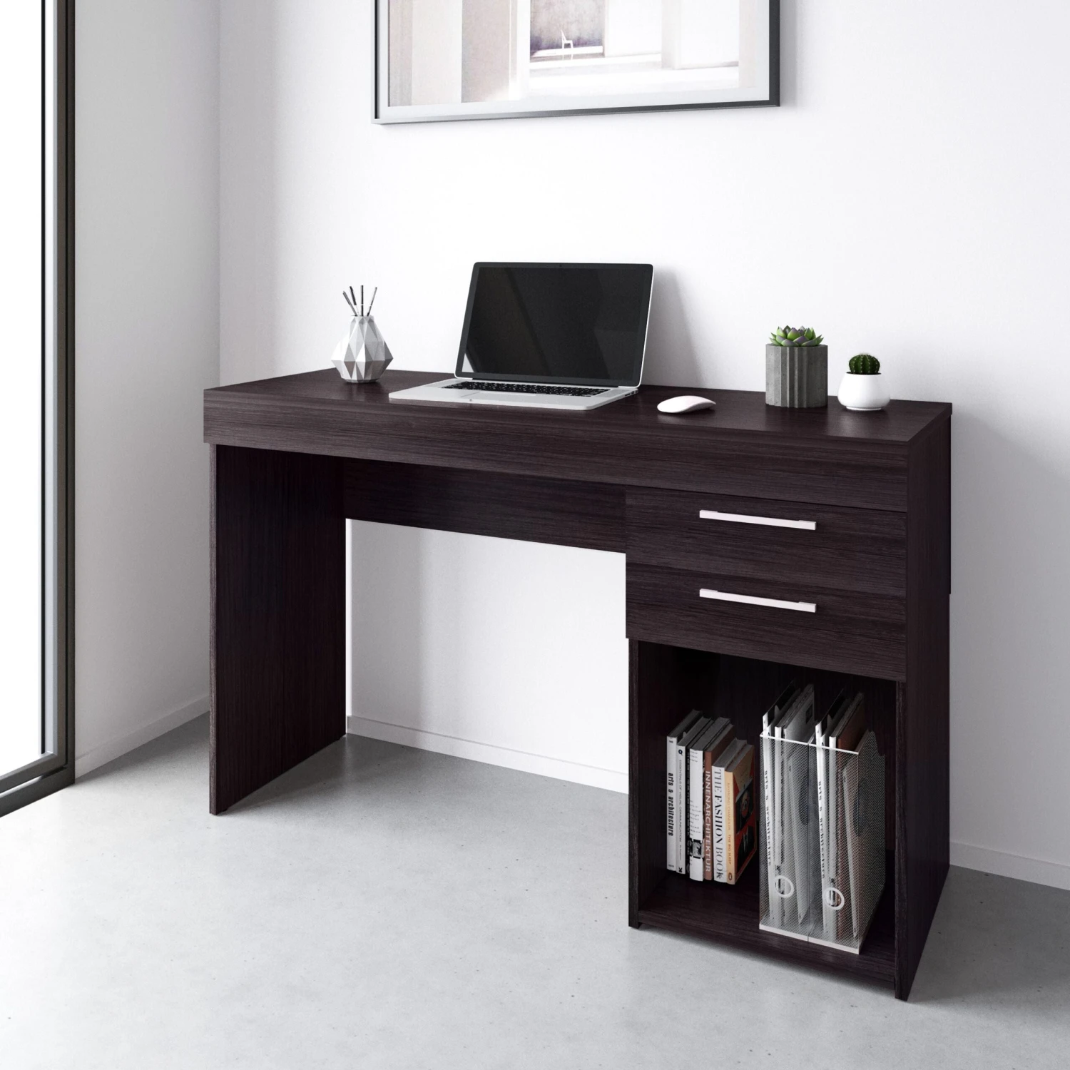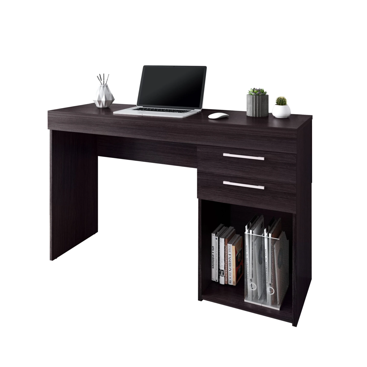 This stylish desk by Techni Mobili tucks effortlessly into a corner for the perfect workspace. In a rich dark espresso finish, it blends with a variety of office decor, while crisp silver hardware makes for a stunning, modern contrast. Two drawers and a shelf tuck beneath the four foot top, while an overhang adds weight to the structure of the desk.