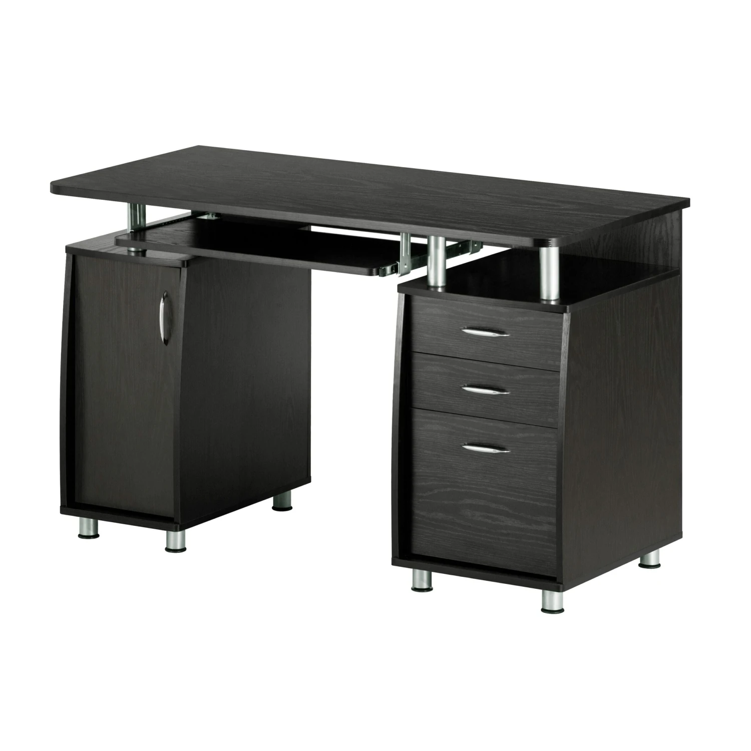 Clean and compact, this desk in a deep espresso woodgrain mixes function with an elegant form. A three-drawer file rests beneath one edge of the desk, while a cabinet holds up the other side and a sliding keyboard tray tucks between them. Use the generous raised surface for any and all office needs.