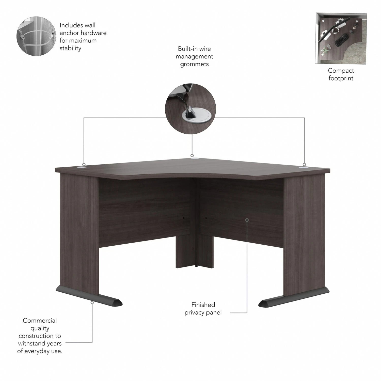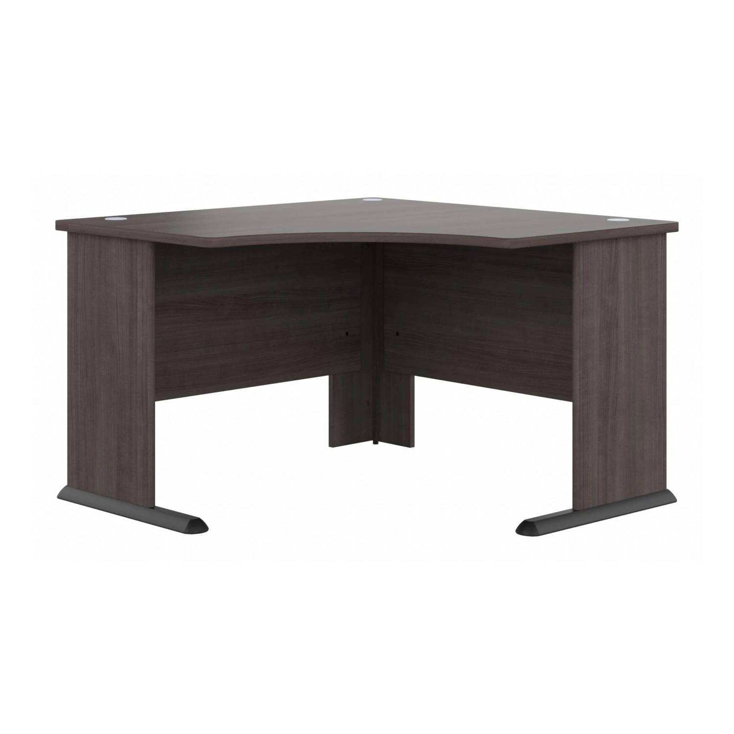 This compact 48″ corner desk from premier manufacturer BBF is a perfect combination of commercial quality, optimal functionality, and modern style. It is designed to be placed in the corner of your choosing while allowing you to spread out with a computer and work materials on a durable, thermally-fused laminate desktop. A built-in wire management grommet helps keep the area clean, and the base features adjustable levelers to compensate for uneven floors. The storm gray finish is a darker hue that brings a subtle splash of modern vibrancy. The desk is backed by a 10-year manufacturer warranty. For additional storage, add on the optional storm gray bookcase or pre-assembled file cabinet!