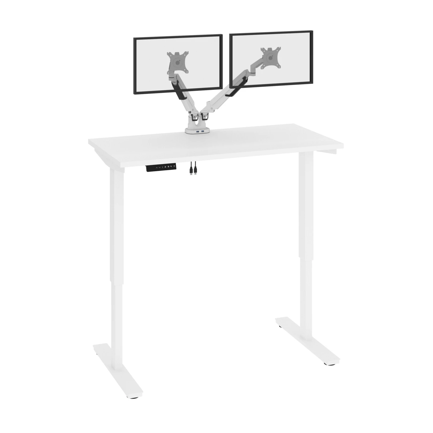 Clean and refined, this desk holds a massive amount of function in the broad, four foot top and twin monitor arms for extra screen space. In a solid white finish, it exudes elegance, perfect for a variety of office designs. The small footprint allows for easy storage and placement of this desk anywhere, including even in a closet for the home office. The entire surface of the desk raises and lowers with the press of a summary for effortless customization. Fill a need for even more office storage with the optional matching bookcase and file.