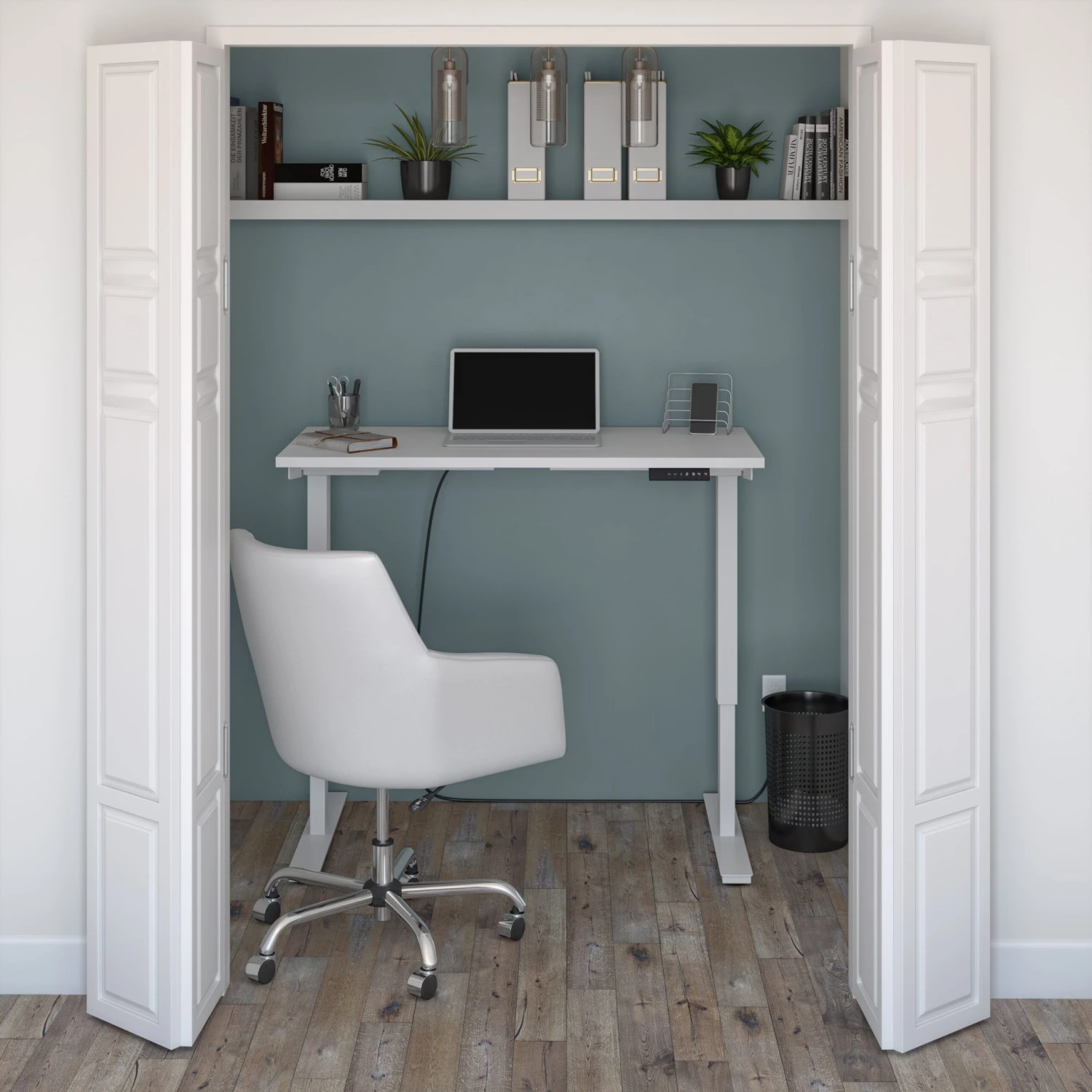 Dainty and ergonomic, this desk is broad enough to handle the average project, while still maintaining a small enough footprint to fit in a minimalist office, even tucking into a closet for a home office! With a crisp white finish on the body and legs, it has a distinctly modern twist: the entire top adjusts with the press of a summary to the perfect height! A small electric motor in the rear of the desk ensures a quiet adjustment. If you are in need of extra storage around the office, consider adding on the optional bookcase and file to match.