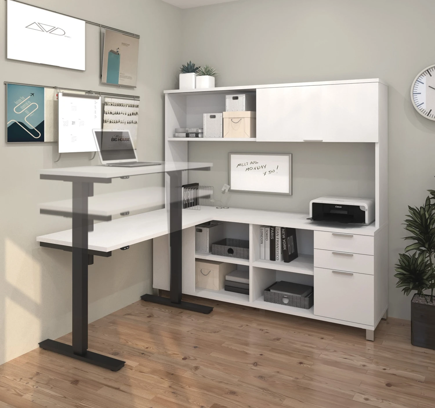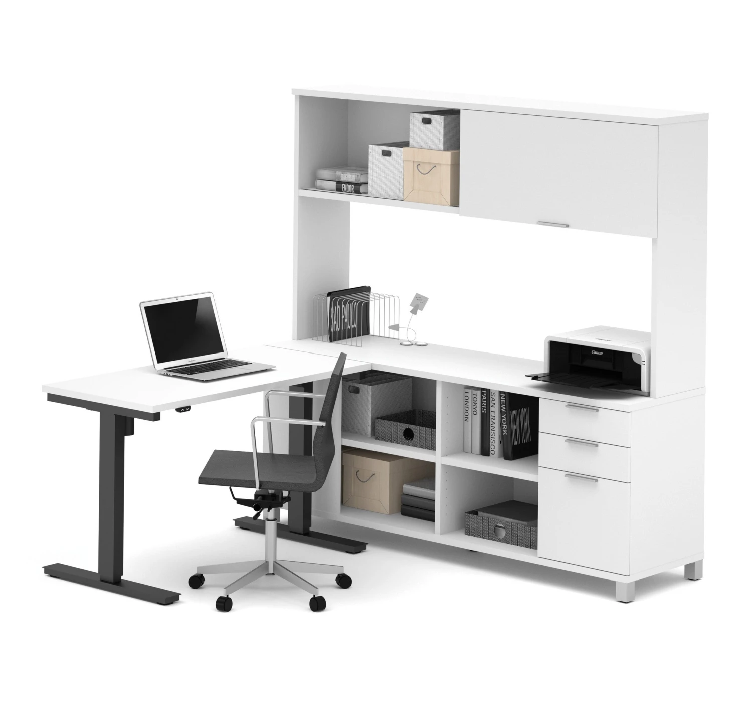 This great combination from Bestar boasts modern looks and amazing functionality. Included is a 71″ credenza & hutch with a file drawer, two utility drawers, and shelving & cabinets for storage – and also a height-adjustable desk that shifts electronically from 28″ in height to 45″. This means you can work sitting for a while, and then quickly and easily move the table up so you can stand while working, increasing circulation and improving overall health. Both pieces are extremely durable and well made as well, and are coated in melamine to prevent scratches and stains to the surfaces. If you need more space for files or office items, add on the optional lateral file or credenza.