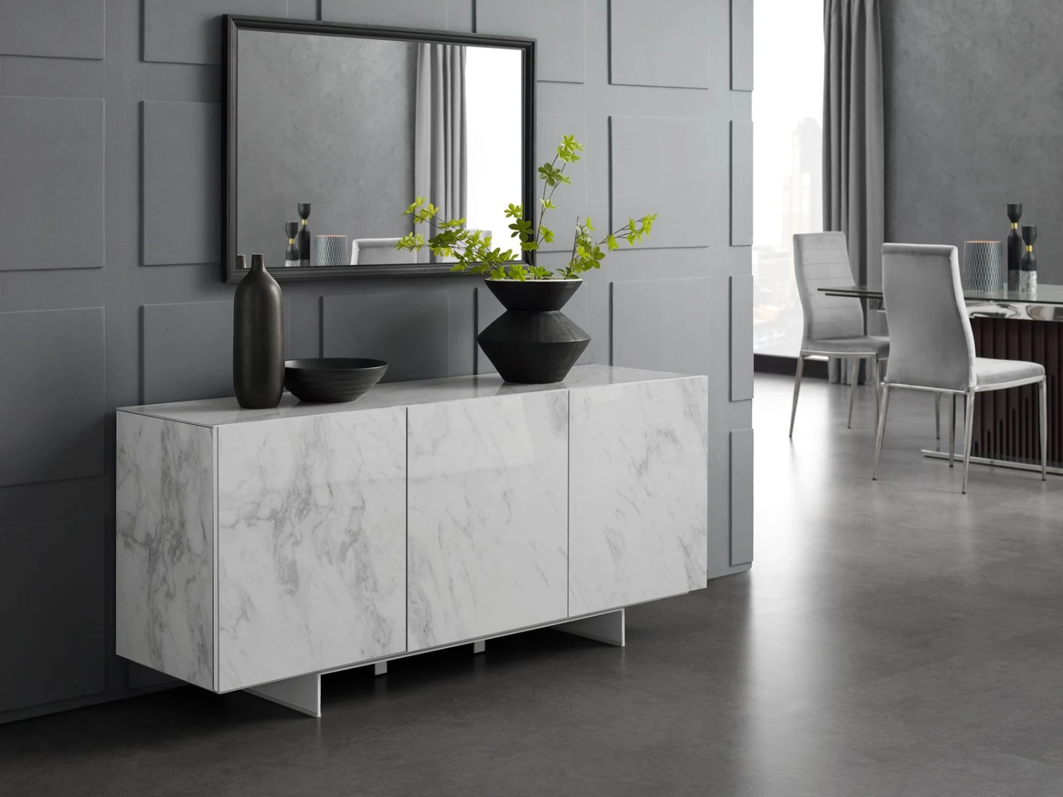 Crisp marbled glass covers this elegant credenza in bright white, struck through with silvered veins, for a stunning sidepiece to any office decor. The modern design and smooth finish make for a thoroughly striking piece, while three doors and four interior shelves ensure plenty of practicality.