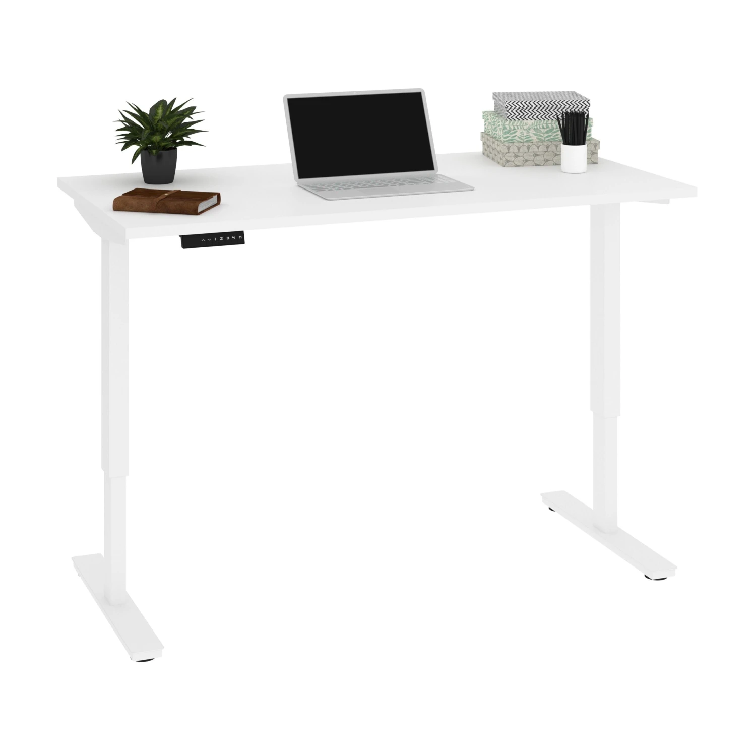 Boasting an ultra-modern design and a small footprint, this standing desk offers the maximum in versatility. The crisp white finish blends into a variety of office designs, while a melamine finish on the top ensures protection against scratches and stains. The entire surface shifts height with the press of a summary to adjust from sitting to standing effortlessly, granted by the slim electric motor tucked in the rear of the desk. In need of more storage? Consider adding on the optional matching bookcase and lateral file.