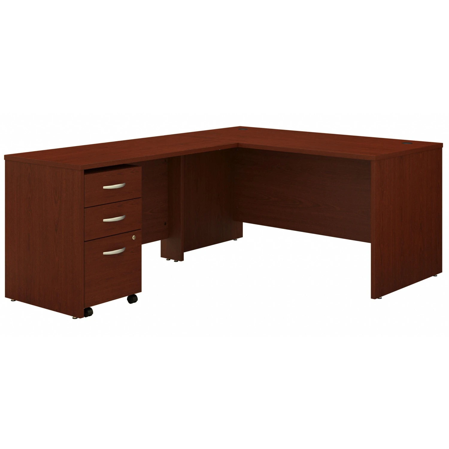 This gorgeous modern office desk from premier manufacturer BBF is the ideal combination of optimal functionality, reliable quality, and modern elegance and style. The extensive surface and L-shaped design is easy to spread out on with work materials, while it is easy to stay organized as two built-in wire-management grommets prevent clutter of cables and cords. The mobile 3-drawer pedestal provides plenty of storage with a lockable full-extension file drawer and 2 box drawers. The long-lasting fresh appearance of the surface features a thermally-fused laminate coating that protects from everyday cosmetic damages like scratches and stains. The beautiful mahogany finish is a classic, professional tone that also brings a contemporary vibrancy perfect for the modern professional. The desk is backed by a 10-year manufacturer warranty.ย