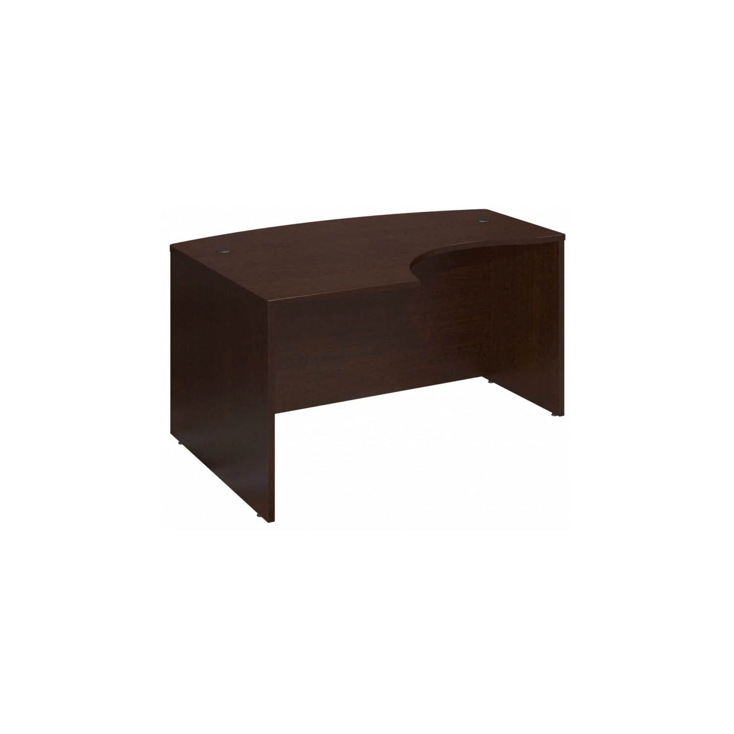 This modern desk from BBF is the perfect choice for the modern professional, blending practical functionality, reliable quality, and contemporary appeal. Spread out on the spacious surface with an extended bow-front and left-handed configuration that allows you to comfortably utilize all of your work materials and electronics. Two integrated wire-management grommets keep the area tidy of cables and cords to help you stay organized as you work. Its clean and professional appearance is preserved for long-lasting appeal by a thick, thermally-fused laminate coating that supports up to 200 pounds of materials. Clean lines deliver a sleekness that will look great in any office or home, and the mocha cherry tone blends a traditional tone with contemporary sophistication. The desk is backed by a 10-year manufacturer warranty.ย