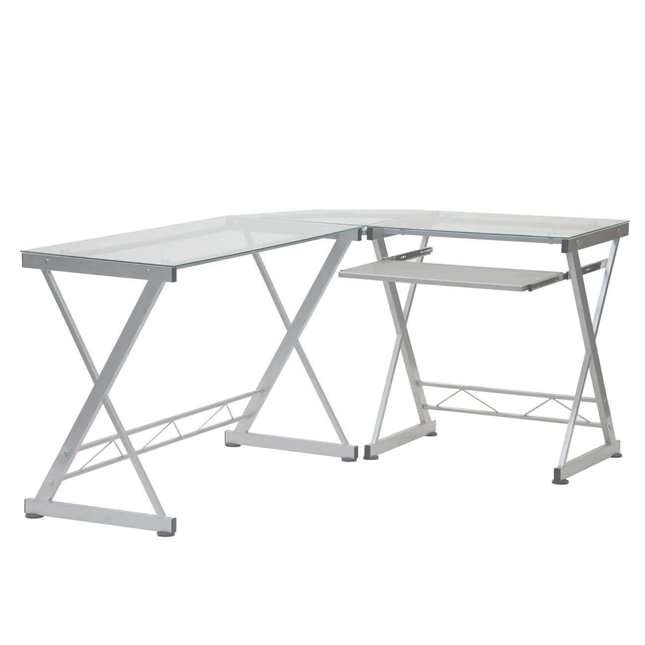 Sleek and efficient, this desk in glass and matte silver is eye-catching, with four hourglass-shaped legs supporting the top. Ladder bracing provides stability across the back, while a sturdy sliding keyboard tray mounts beneath the surface. Use the generous L-shape for extra room on large projects, or to add some decor to your space.