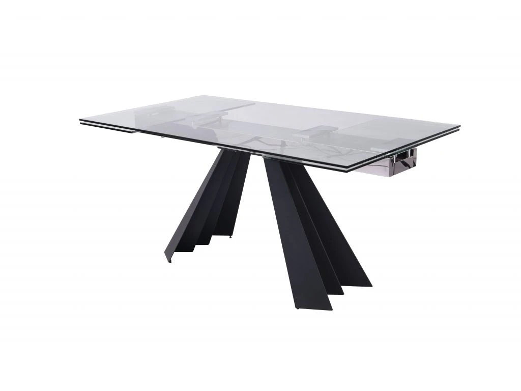 Ornate and elegant, this conference table with premium glass top stands apart through the ultra-modern black legs, which stand in a unique fan shape. The glass top holds two extendable panels, which slide out to accommodate a larger group or project.