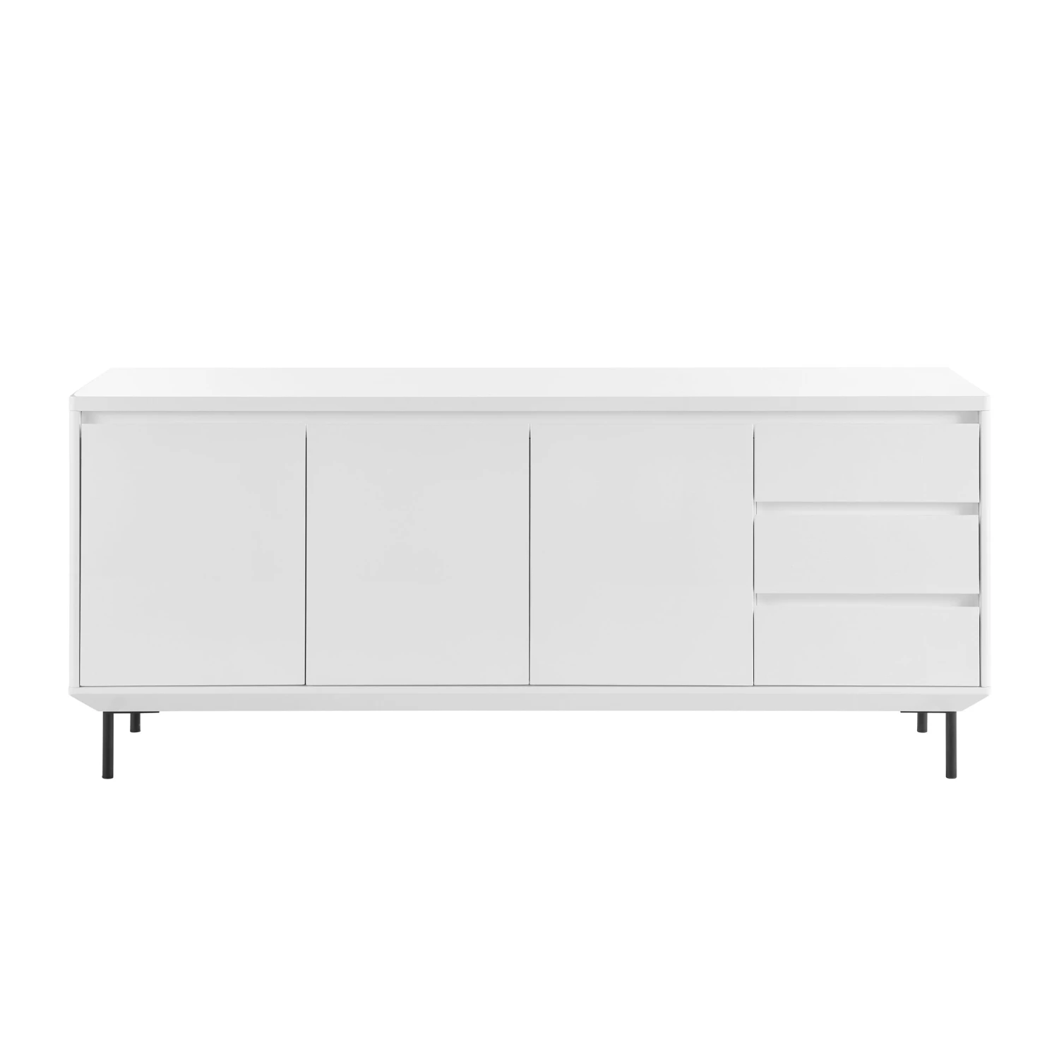Balancing delicately on four sturdy metal legs, this credenza holds a surprising amount of storage for its petite size. Three broad doors conceal four deep shelves, while a set of three drawers tuck to the right of this credenza to hold extra office necessities, books, files, and more! In a brilliant white finish, it is easy to clean, and stands out beautifully in any office. Use the expansive top to hold a vast array of office needs, including a printer and scanner!