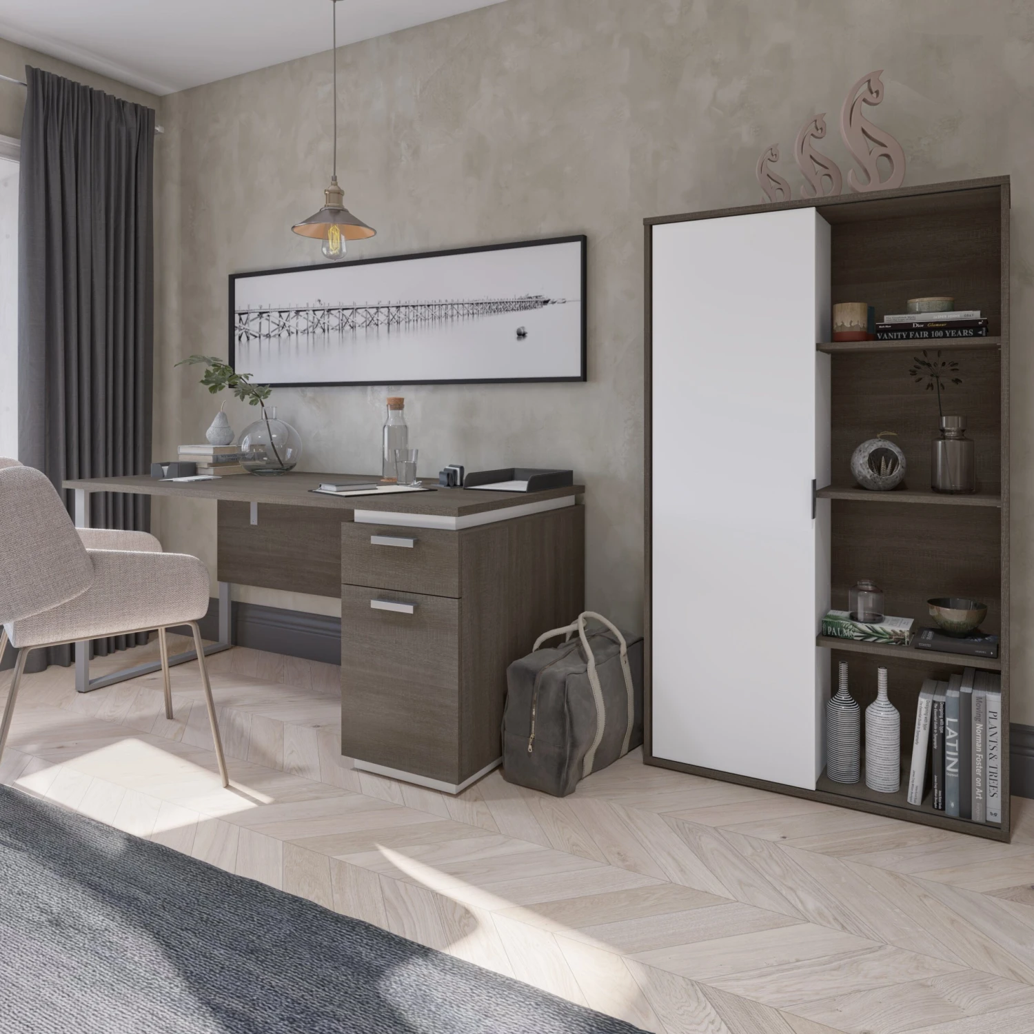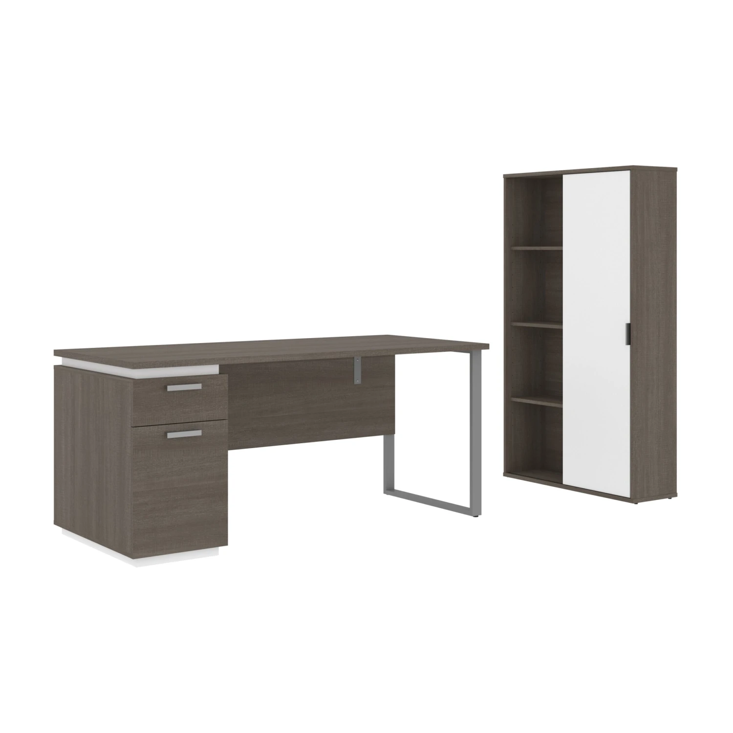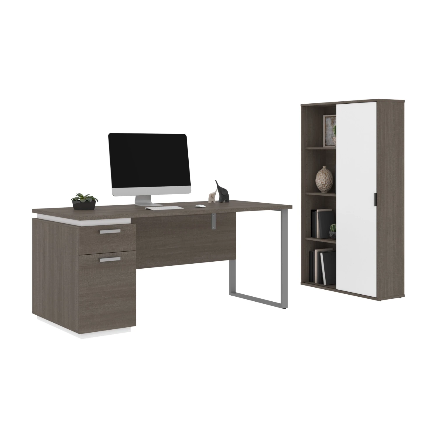 This rugged executive desk set is sure to turn heads, including both a desk and large cabinet. The desk holds two deep locking drawers for storage of files and office necessities, while the cabinet holds four open shelves and four closed shelves behind a door. In a bark gray woodgrain finish with white highlighting, it blends with a variety of rustic office designs. A melamine coating ensures that this desk will last for years to come without scratches or stains. If you are in need of even more office storage, consider adding on the optional file cabinet to match.