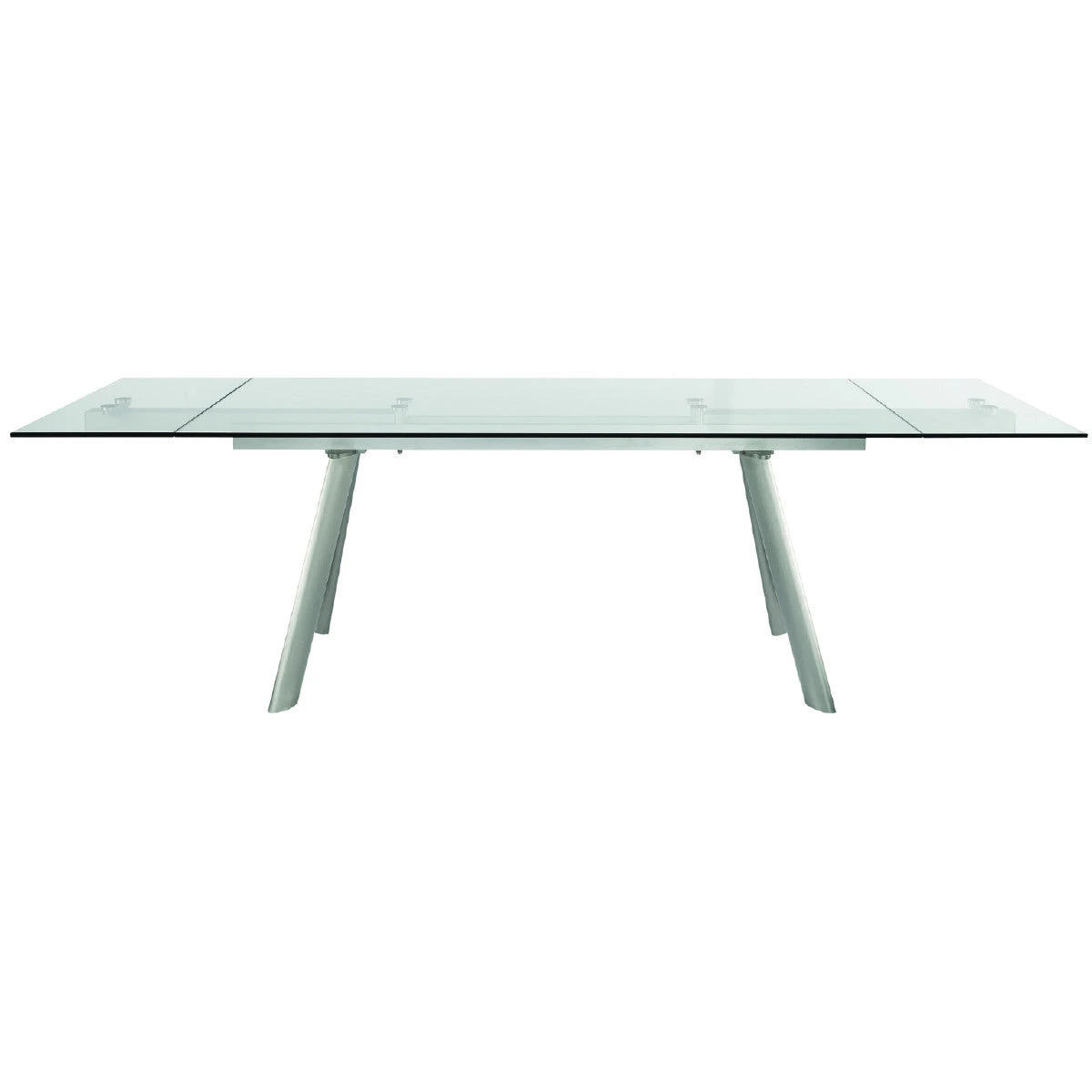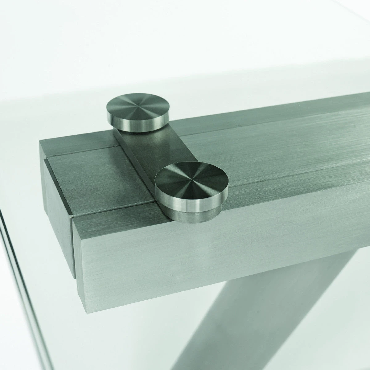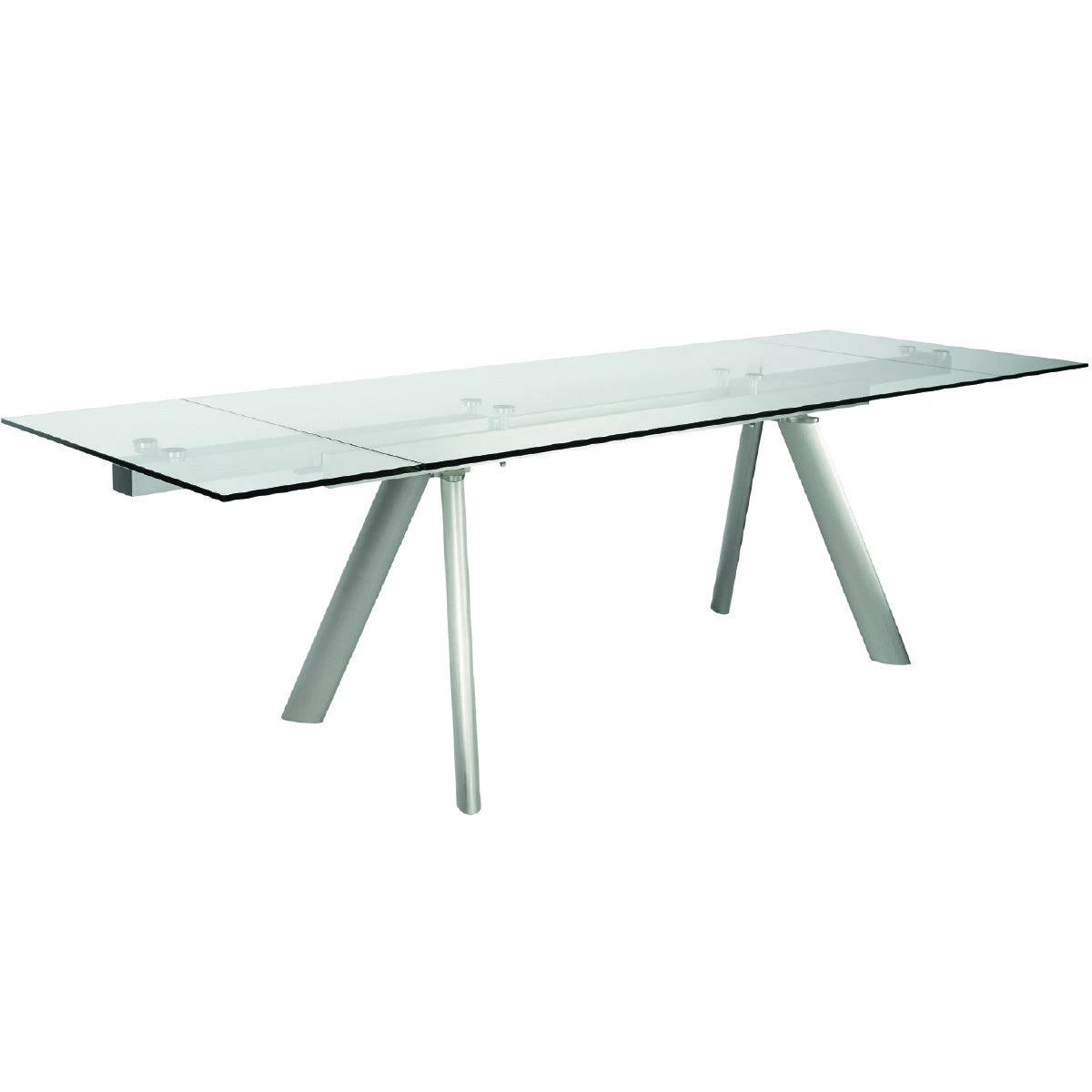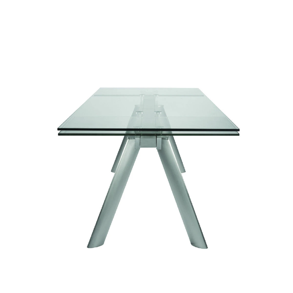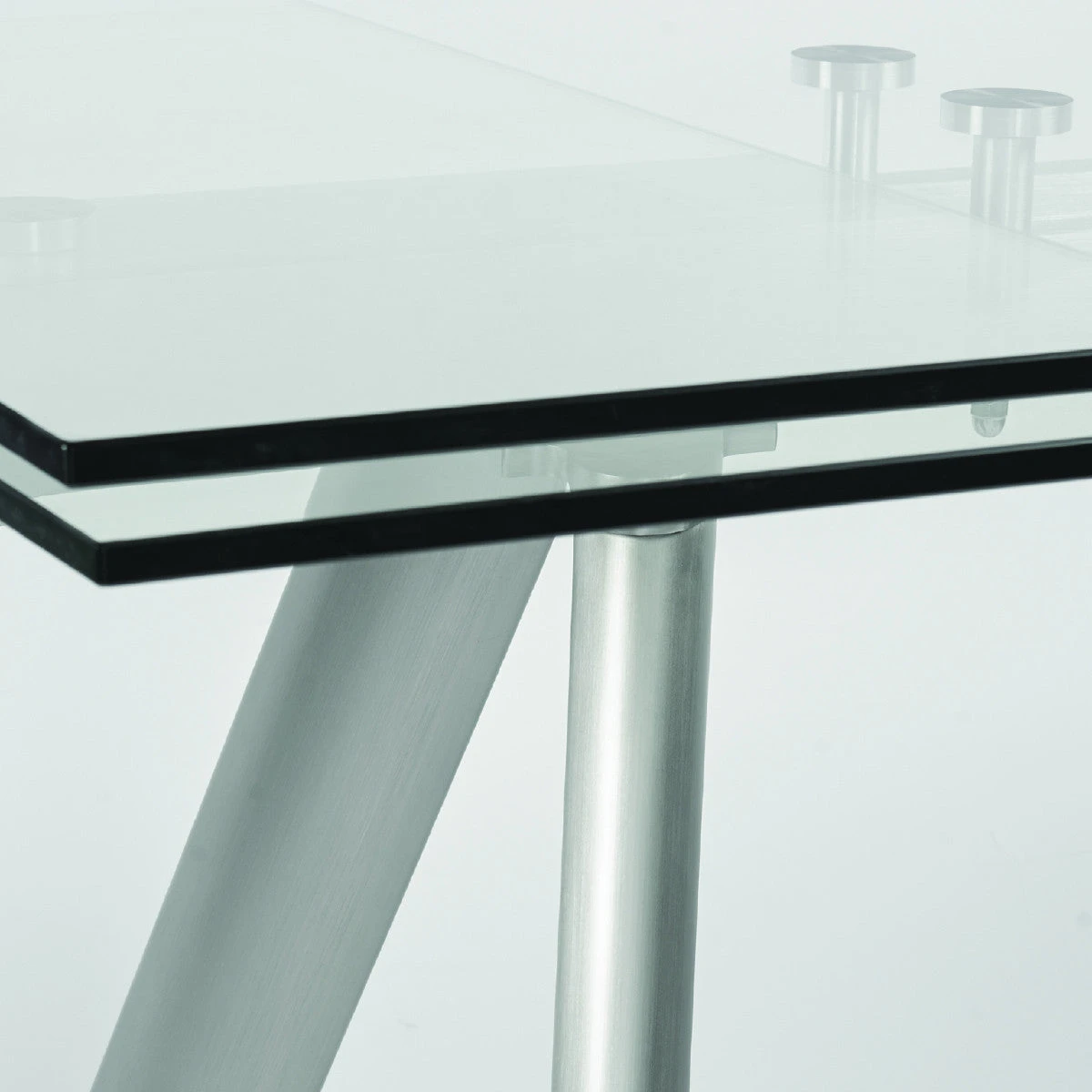 This new offering from premium manufacturer Euro Style is great looking, functional, and manufactured to last.ย Its looks combine a clear glass 12mm top with elegant brushed stainless steel legs for a modern, appealing look.ย Functionally it extends from 71″ all the way to 102″, so you can easily fit your whole team around the table to hash out your next idea!ย The two extension leaves extend the table to the longer length, or back down, quickly and efficiently.ย The table is built with integrity by Euro Style, a premium manufacturer, of the finest materials, so you can have peace of mind it will last.