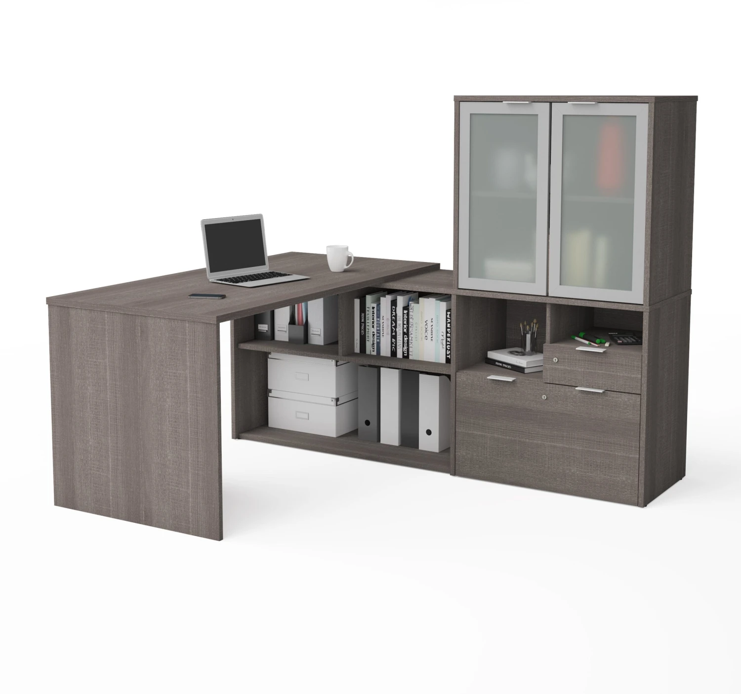 This modern desk offers spacious storage through five open cubbies, two securely locking drawers, and a frosted glass hutch for extra privacy. With a reversible design, it is easily customizable to fit your office space. The smooth bark gray finish creates a professional backdrop, and the desk is sure to last, finished with a scratch-resistant melamine coating and backed by Bestar’s 10-year warranty. Need even more storage for your office? Include the optional matching bookcase and file cabinet!