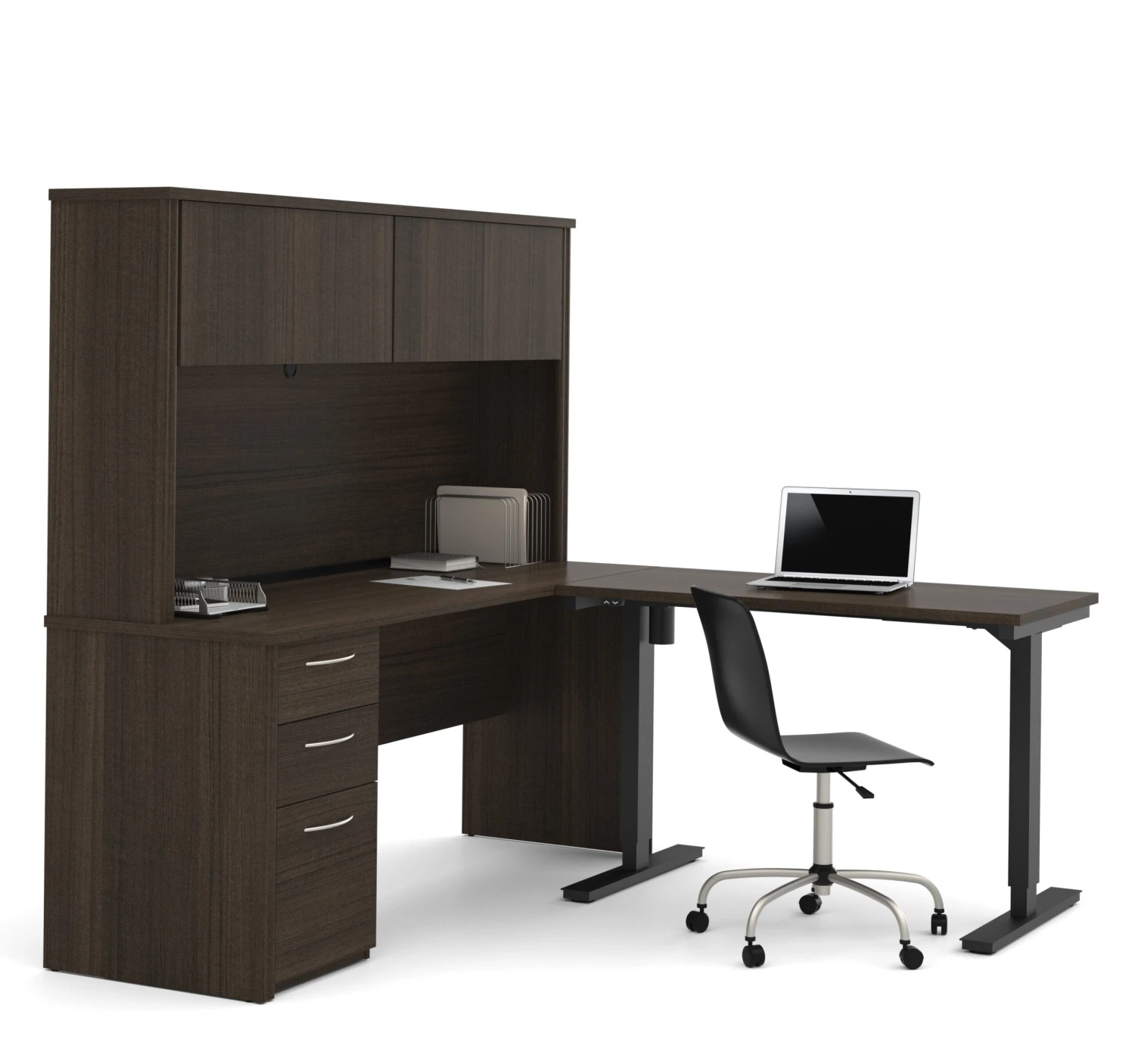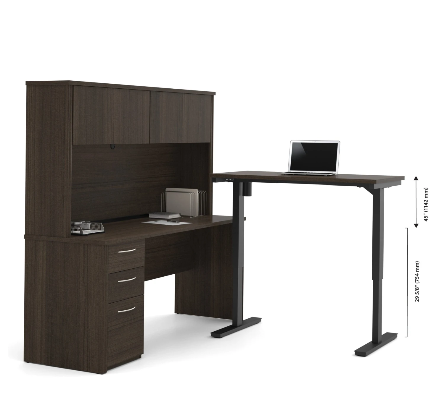 This sturdy desk from Bestar is premium, handsome, and practical. It features two dark chocolate surfaces for spreading out and working, one of which has an adjustable height so you can use it as a standing desk if you wish. The adjustable table is held up by sturdy metal legs and is adjusted using a electronic mechanism that is very quiet. The other portion of the desk features pedestal with two storage drawers and a file drawer, as well as a hutch with two doors with added storage space. The shape of the desk is reversible to adapt to any office. You can add on the matching bookcase and file for even more space to store your documents.