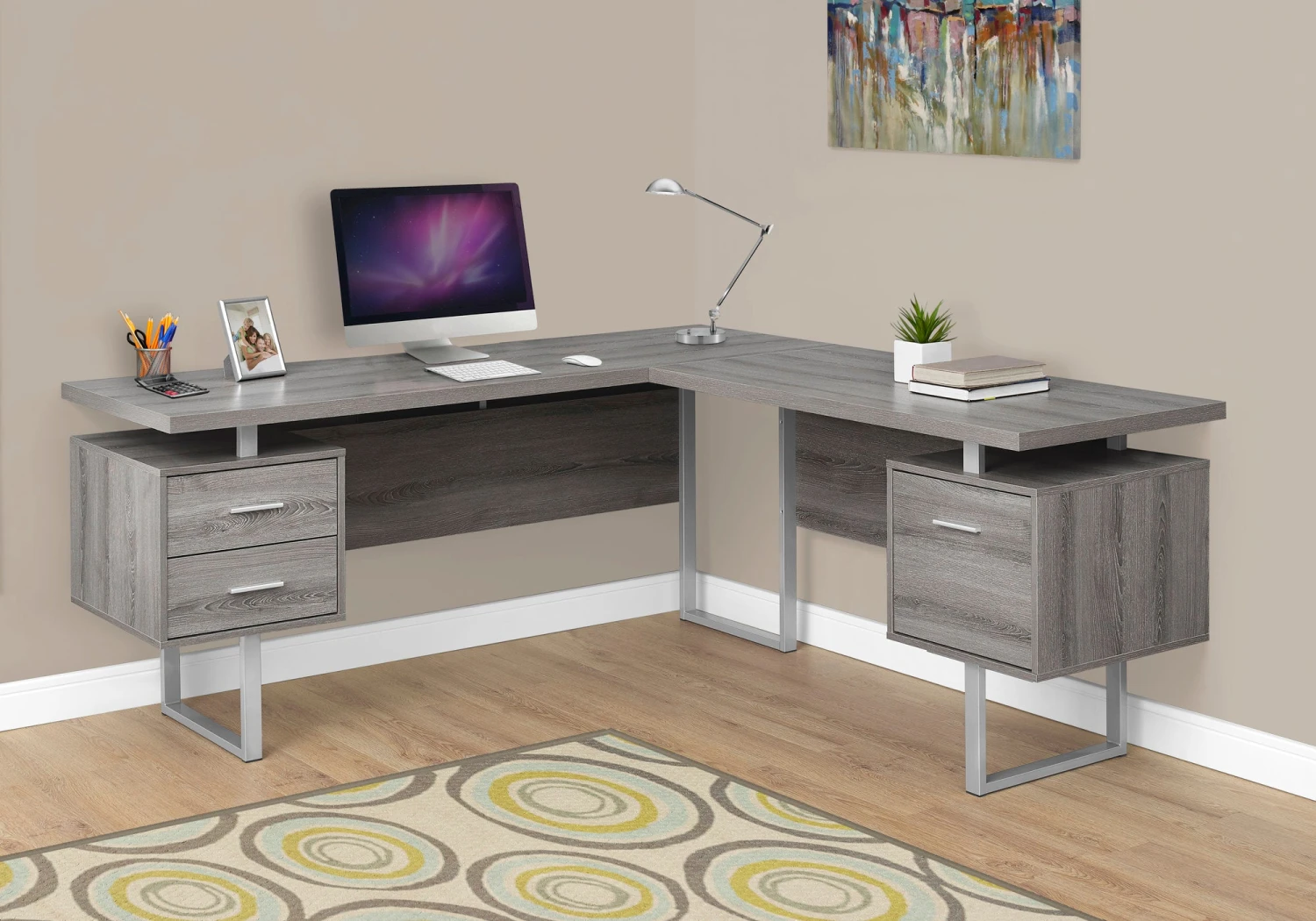 This corner desk is a fantastic choice if you are looking for a desk you can spread out on. It features two pedestals, one offering a single deep drawer and the other holding two storage drawers, to help you keep your desk clutter free. The has sleek metal legs make the desk durable and sturdy, and silver hardware draws the eye and provides a crisp contrast. With enough space to set a computer or two, photos, personal items, files, and a printer to boot, this desk is perfect for the busy office.
