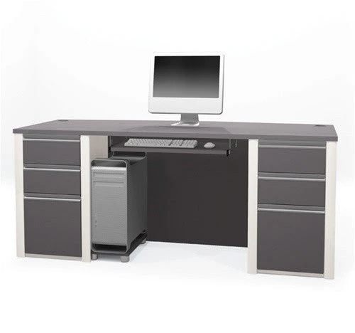 This desk is fully loaded for a great price. Check out the set of 4 utility drawers and 2 file drawers, all operating on ball bearing slides. No ugly chips or scrapes on this desk top, no matter how heavy your paperweights – this work surface is coated in melamine for years of glossy perfection. Keep your keyboard clean on the gliding keyboard tray, and your CPU conveniently close but out of sight on the CPU stand. Last but not least, cords are a thing of the past once you thread them through the wire management grommets. 10 year warranty! Add the optional lateral file cabinet if you so choose.