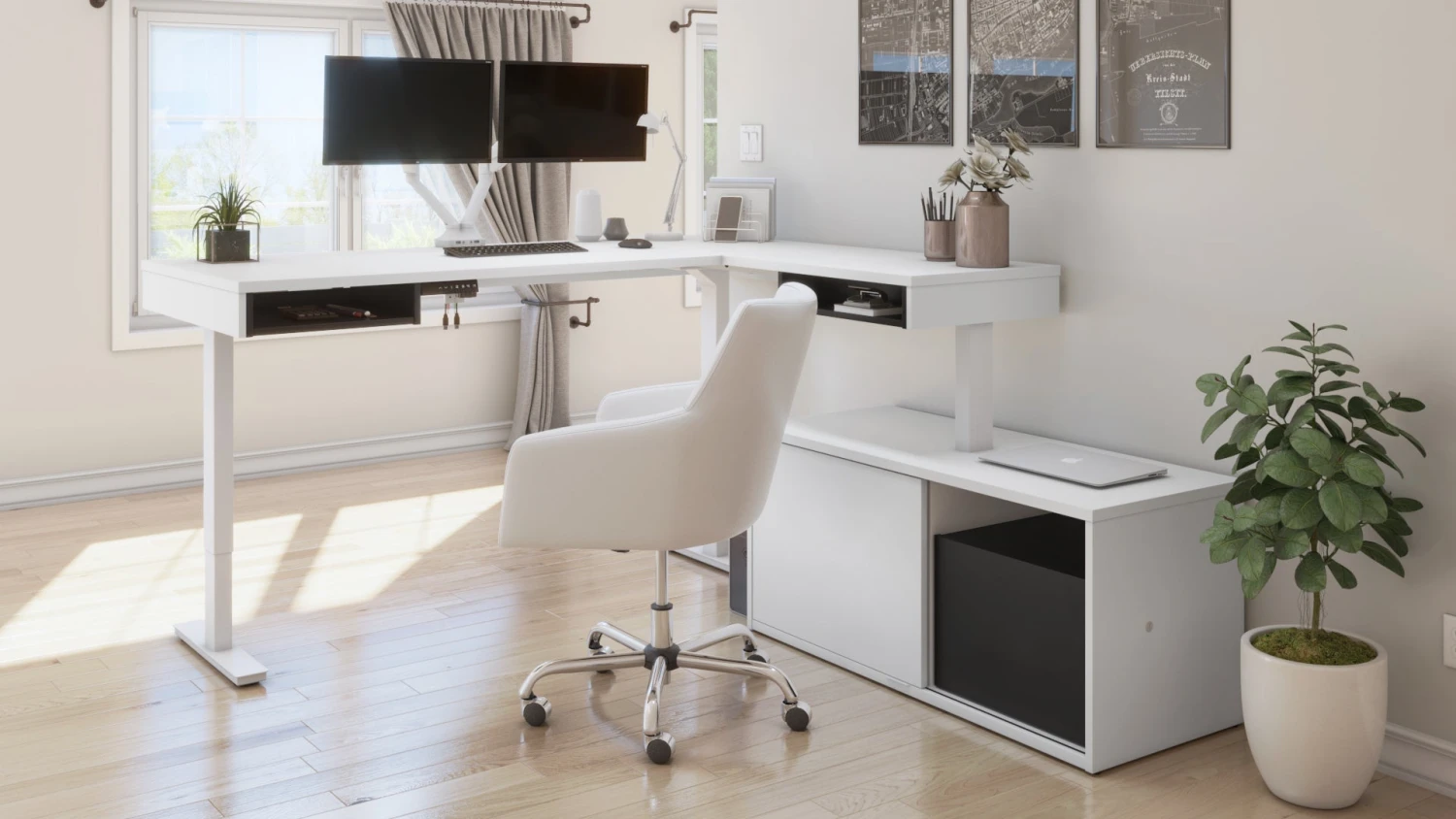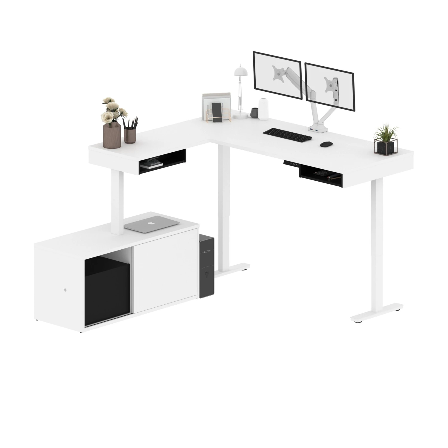 Designed for a busy workspace requiring extra monitor room, this desk offers dual monitor supports and an attached credenza for extra storage. The desk includes two slim storage compartments under the surface, and the credenza holds a locking file drawer and several shelves behind a sliding door. Not only is this desk reversible in design, the desk surface will adjust from 28″ all the way to 45″ high, perfect for either sitting or standing comfortably, via a simple push of a summary! Save your settings for the perfect height on the digital display built into the desk. Backed by Bestar’s 10-year warranty and melamine-coated for extra protection against scratches. In need of extra storage? Add on the optional file cabinet and bookcase to match!