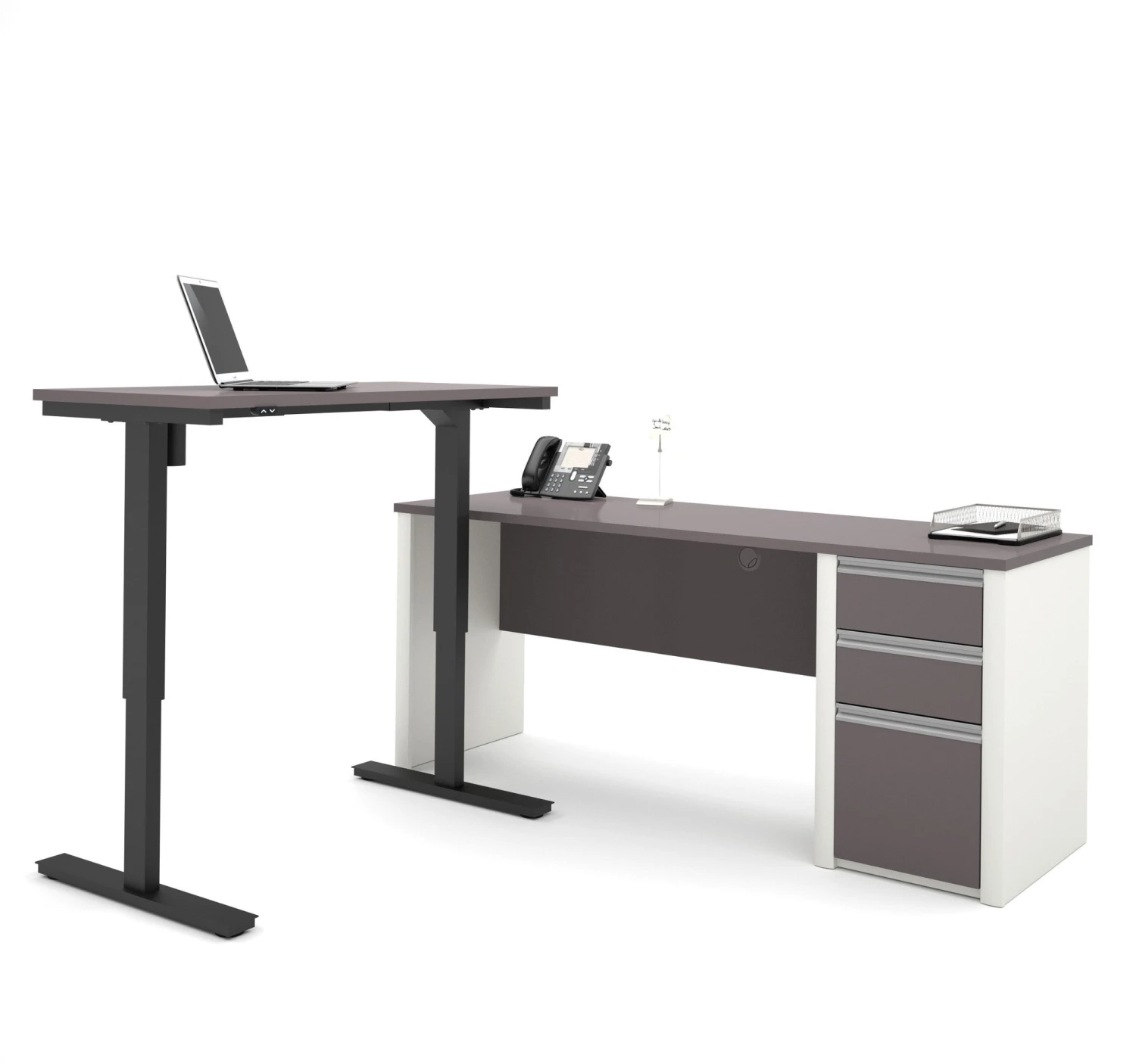 This sleek option from Bestar includes a 71″ single pedestal office desk that has two utility drawers and a file drawer, as well as a 48″ height-adjustable desk.ย As pictured, it can go together to make a great look L-shaped desk, or they can be placed in separate parts of your office.ย The height-adjustable desk moves up and down electronicaly between 28″ and 45″ in height, providing you with the perfect working height and enabling you to work for a while sitting down and then switch to standing, which assists in circulation and overall health.ย This unit offers premium quality that will last for the long haul.