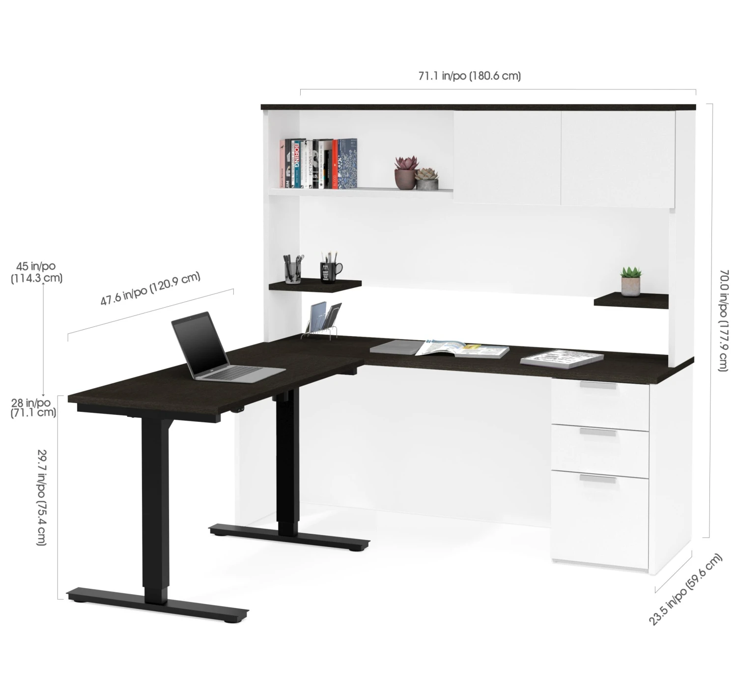 A gorgeous new release from Bestar, this white & deep gray single pedestal desk with hutch will outfit any office with modern style.ย The desk & hutch portion provides all the space you need for storage, including a roomy hutch, two utility drawers, and a locking file drawer.ย This pedestal can go on either side of the desk you prefer.ย The height adjustable portion enables you to stand for a while, then sit back down to keep you loose and healthier.ย You can lower it to make it a traditional L-shaped desk or keep it at two levels so you can quickly move back and forth between sitting and standing.ย The entire unit is manufactured with precision of the finest materials, and includes a ten year warranty!