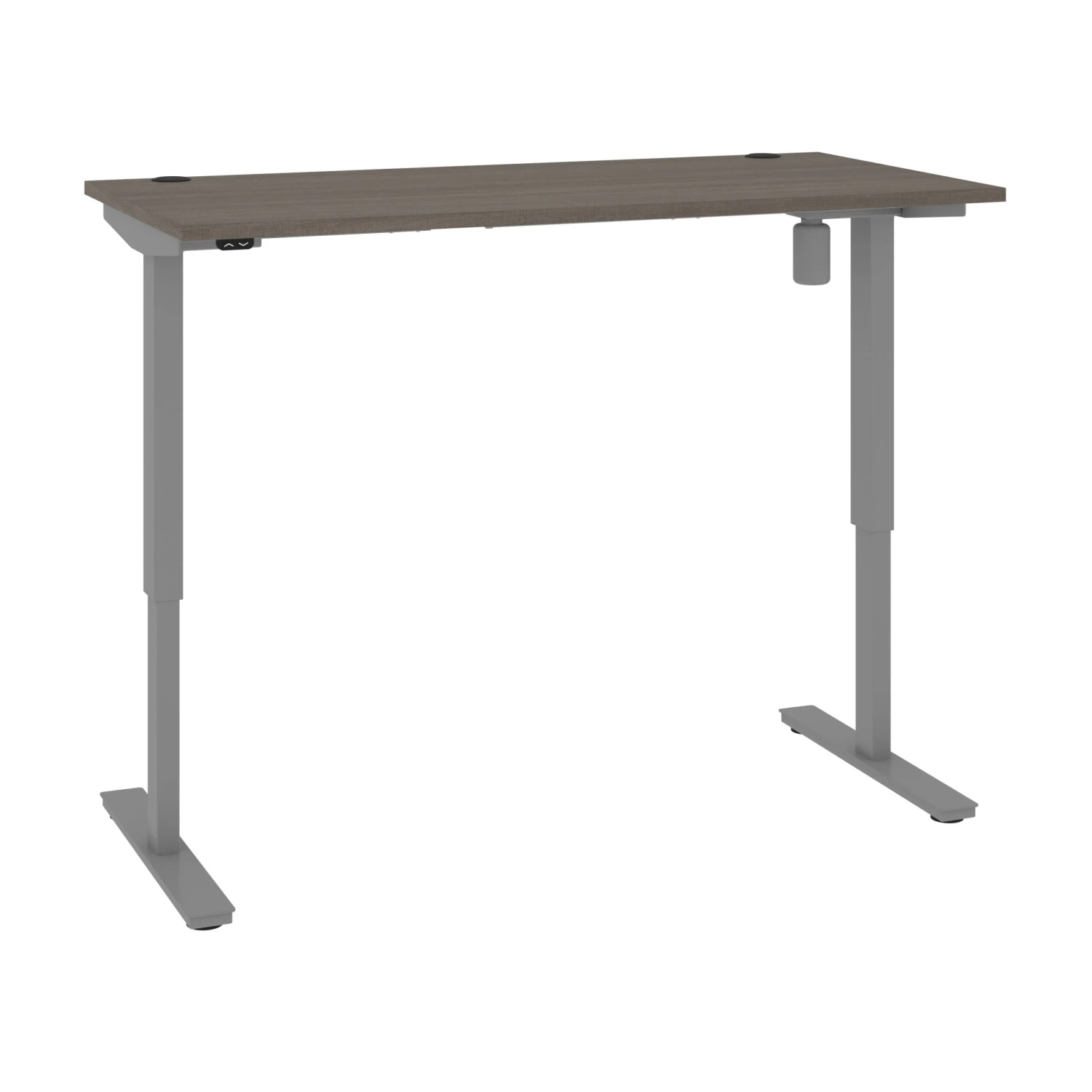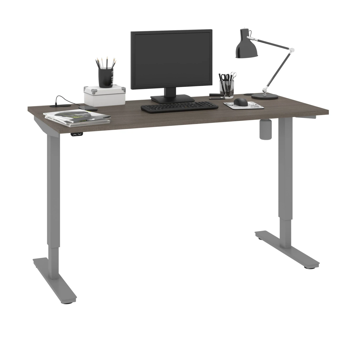 Bold and effortlessly ergonomic, this standing desk offers a great deal of flexibility through an adjustable top. Backed with a small, silent electric motor, the entire top can shift over a foot up and down for a perfectly customized working height. In an elegant bark gray woodgrain finish, with taupe metal legs, it blends perfectly into a variety of office designs. A melamine coating ensures that this desk will last for many years to come. To add extra storage for the office, keeping everything close at hand, consider including the optional matching bookcase and locking file.