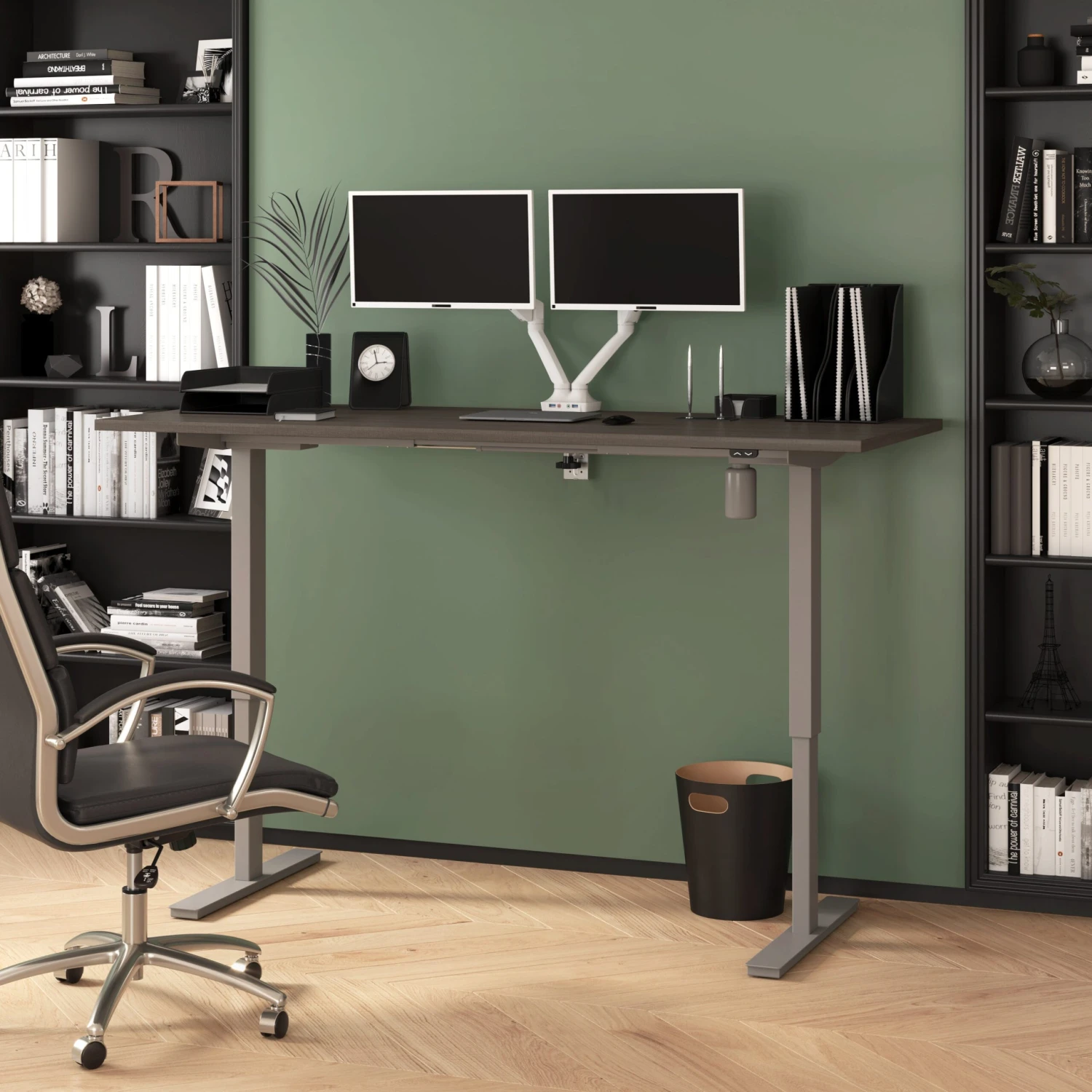 Tackle even the largest digital projects with this expansive desk in an elegant walnut gray woodgrain finish. With two flexible monitor arms, it is designed to hold any project. The broad surface gives plenty of space for the physical side of a project, plus extra room for decor and keeping personal items. The best part? The entire surface of this desk raises and lowers to the perfect height with the touch of a summary, thanks to a small electric motor tucked to the rear of the desk. In need of more storage? Consider adding the optional file and bookcase!