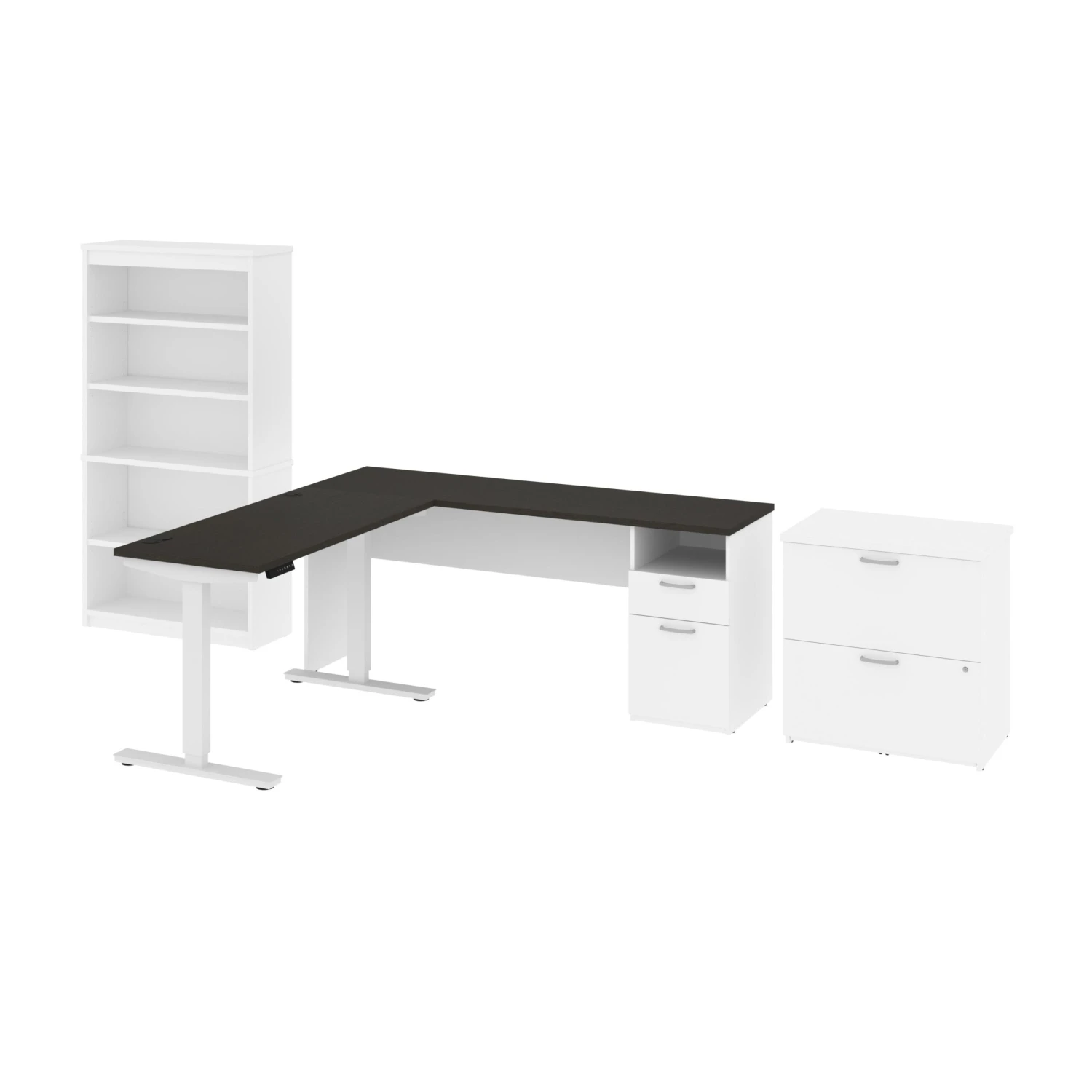 Maximize production in your office with this sleek desk set, including a sprawling L-shaped desk with one adjustable arm and built in storage. A five-shelf bookcase with top and bottom molding adds plenty of extra room for storage, display, and functionality in easy reach, while the included two drawer locking file allows for safe containment of sensitive files & information. The top of the desk is melamine-coated for extra durability, and adjust the branching arm of the desk for the perfect height with the push of a summary. In an elegant deep slate and white finish, it blends effortlessly with a variety of office decor. All three parts of this set come with Bestar’s 10-year warranty for peace of mind.