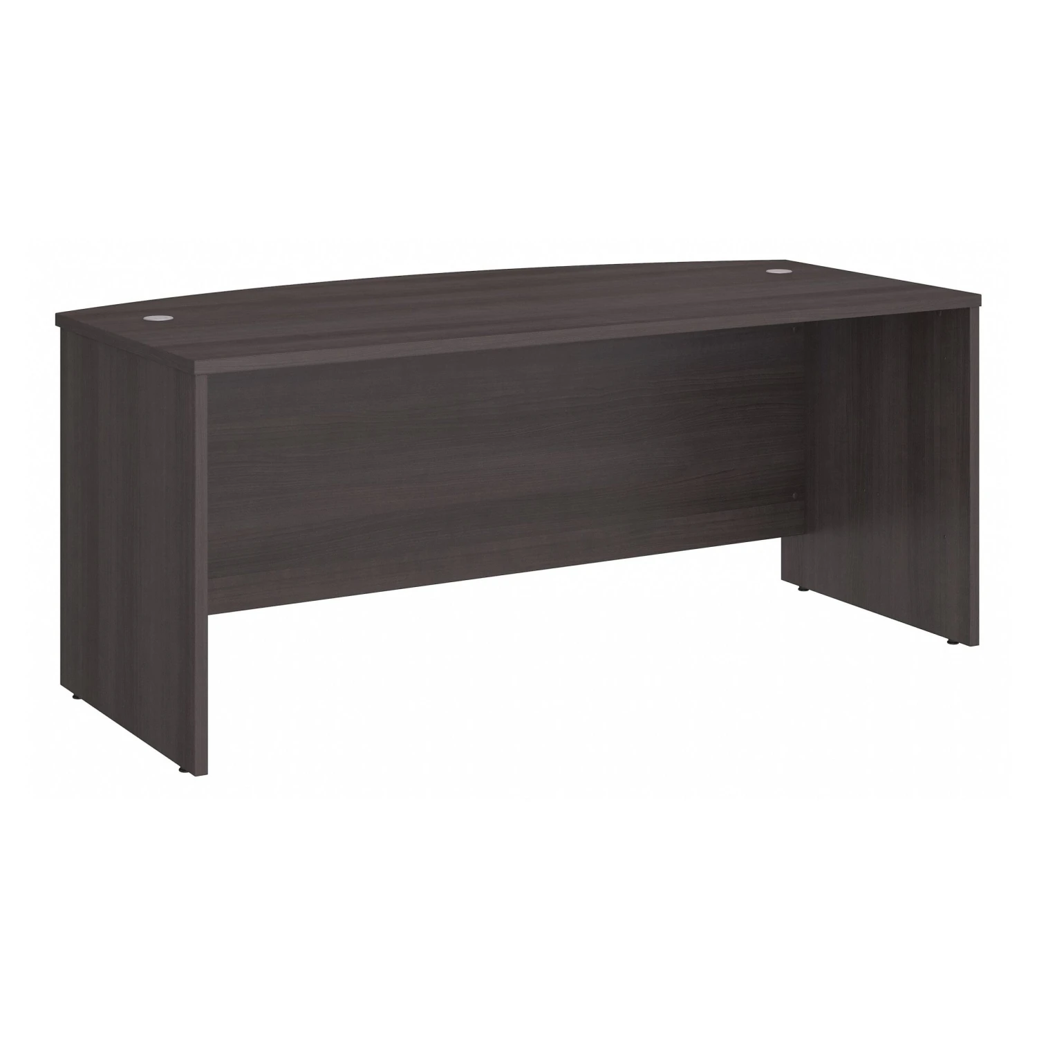 This 72″ modern executive office desk from manufacturer BBF is the perfect choice for a commercial-quality workspace with premier functionality with an elegant modern style.ย The sturdy and durable surface holds up to 200 pounds of work materials while being kept clean of wires with a built-in grommet management system. Additionally, it is protected from everyday scratches and stains by a durable, thermally-infused laminate.ย The bow-front design encourages placement of the desk in the center of the room, while the finished privacy panel allows it to look great from any angle. The storm gray finish presents a subtle but fresh and contemporary tone to any office or home. The desk comes with a 10-year manufacturer warranty. For additional storage, add on the optional storm gray bookcase or pre-assembled file cabinet!
