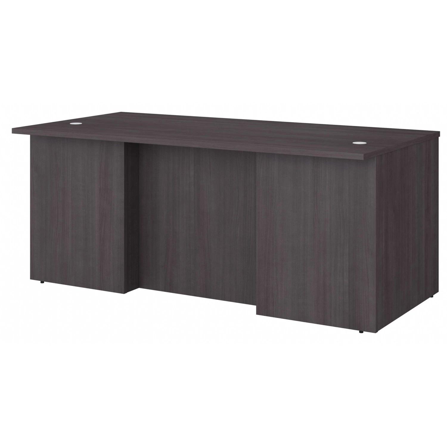 This large 72″ modern executive desk from BBF combines premier quality and functionality while adding contemporary elegance to your office or home. The spacious surface, with its breakfront design extending the center of the desk from its sides, includes two built-in wire management grommets to keep the area clean of cables and cords, and a thermally-infused laminate surface protects against everyday cosmetic damages. This stable and sturdy surface holds up to 200 pounds and is easy to spread out with multiple monitors and work supplies. The storm gray finish lightens the room with a flare of modern sophistication. The desk is backed by a 10-year manufacturer warranty. For additional storage, add on the optional storm gray bookcase or pre-assembled file cabinet!