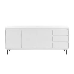 Standing on four sleek black legs, this credenza in a matte white suits a vast variety of office designs. The generous top, at a full 79″ wide, is large enough to hold any office needs, including printers, scanners, photos, and more. Two doors each contain a pair of shelves for storage, while two open shelves allow for books, files, and more to be kept in easy reach.