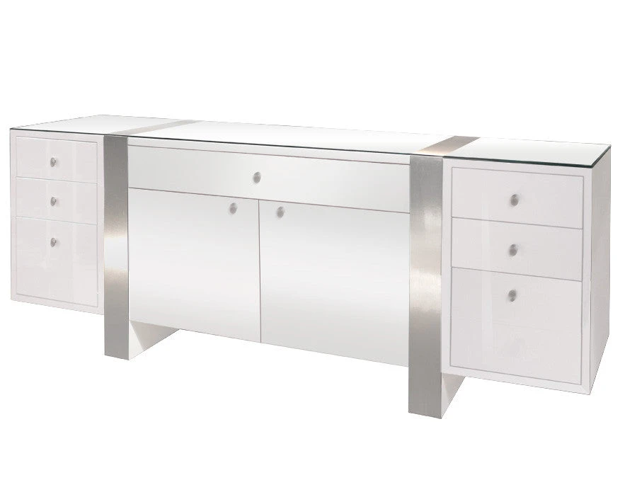 Elegant, classy, unique, and modern all describe this credenza.ย Its premium white lacquer and faux brushed aluminum finishes combine to create a great modern look, and its premium quality ensures this piece will stand the test of time.ย It comes with loads of storage space, including two file drawers, four utility drawers, and a large central cabinet with a central shelf. This beautiful piece will get you organized in style.