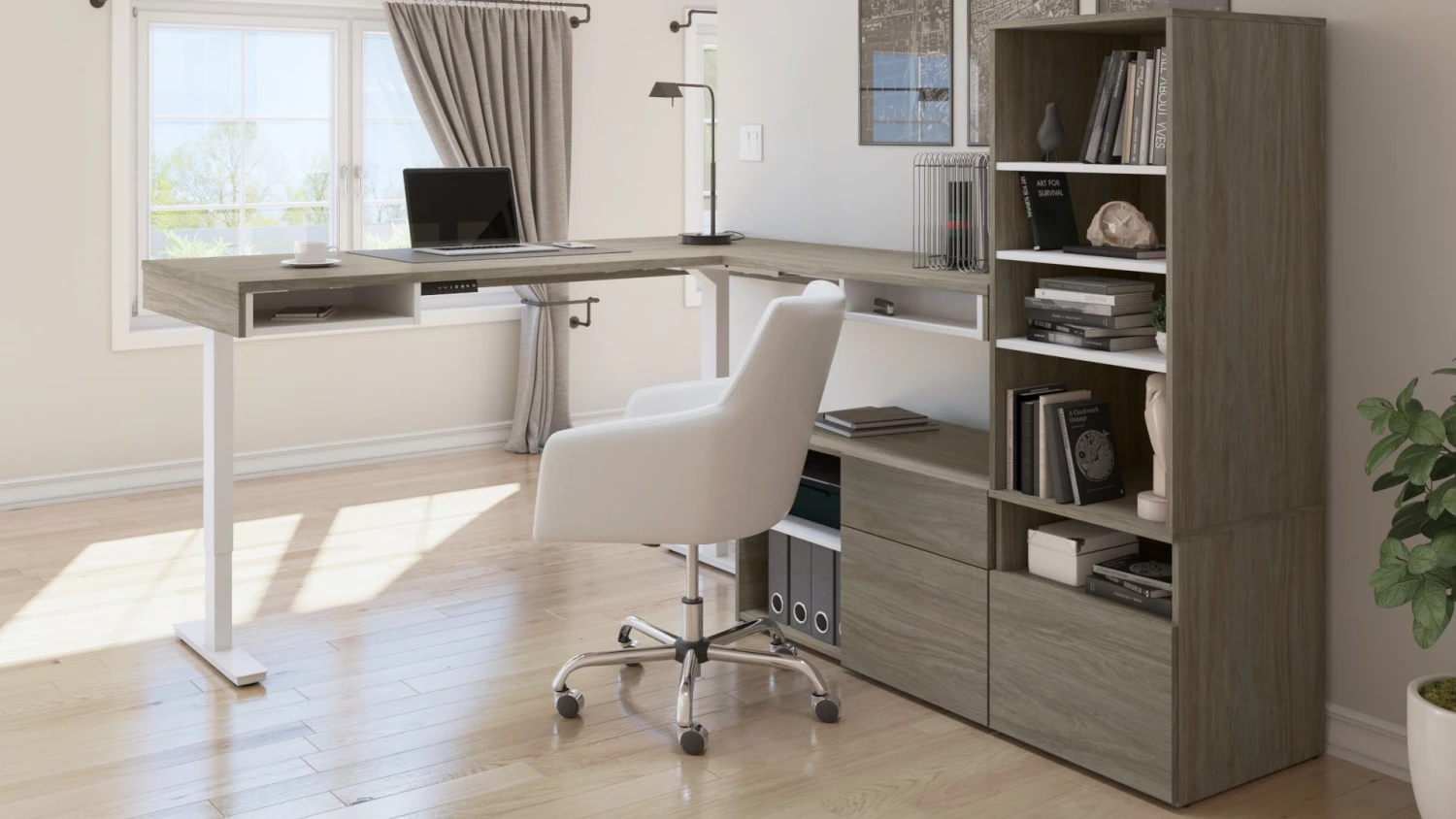 This sprawling desk offers a fusion between modern design and absolute functionality, with a built-in storage complex tucked to one side! The broad L-shape holds a unique design feature: the entire working surface adjusts height with the press of a summary. A built-in bookshelf and credenza give plenty of storage space for even the largest projects, while two slim shelves tuck under the desk surface to keep common tools close at hand. The elegant walnut gray finish gives a warm flair, set off by white highlights. This desk also comes with a 10-year manufacturer’s warranty. If you are in need of even more storage, consider adding on the optional matching bookcase and locking file cabinet.ย