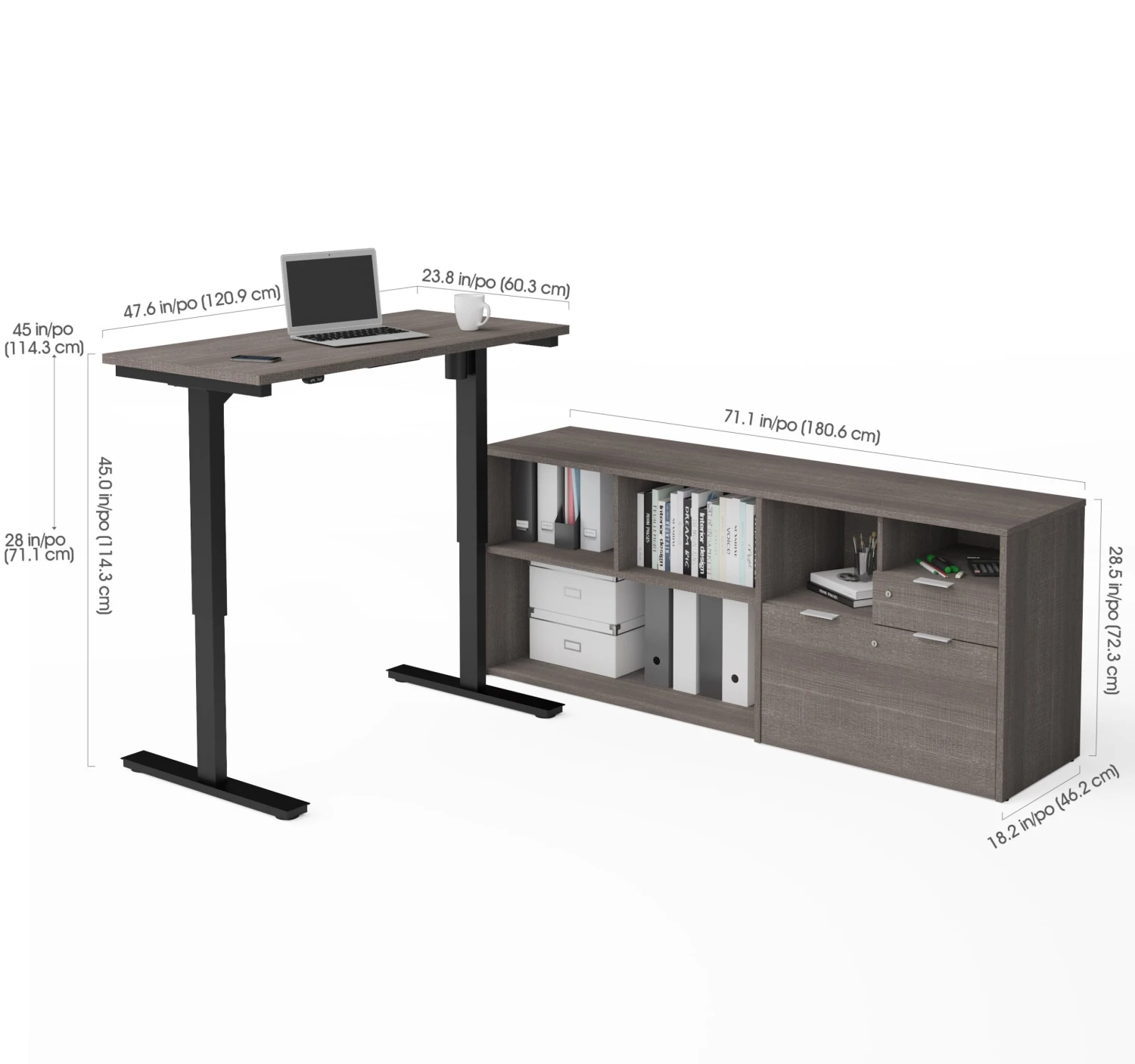 The dimensions of the adjustable desk are 47.5″ W X 24″ D X 28-45″ H. The dimensions of the credenza are 71″ W X 18″ D X 28.5″ H. The dimensions of the file are 30″ W X 18″ D X 28.5″ H.