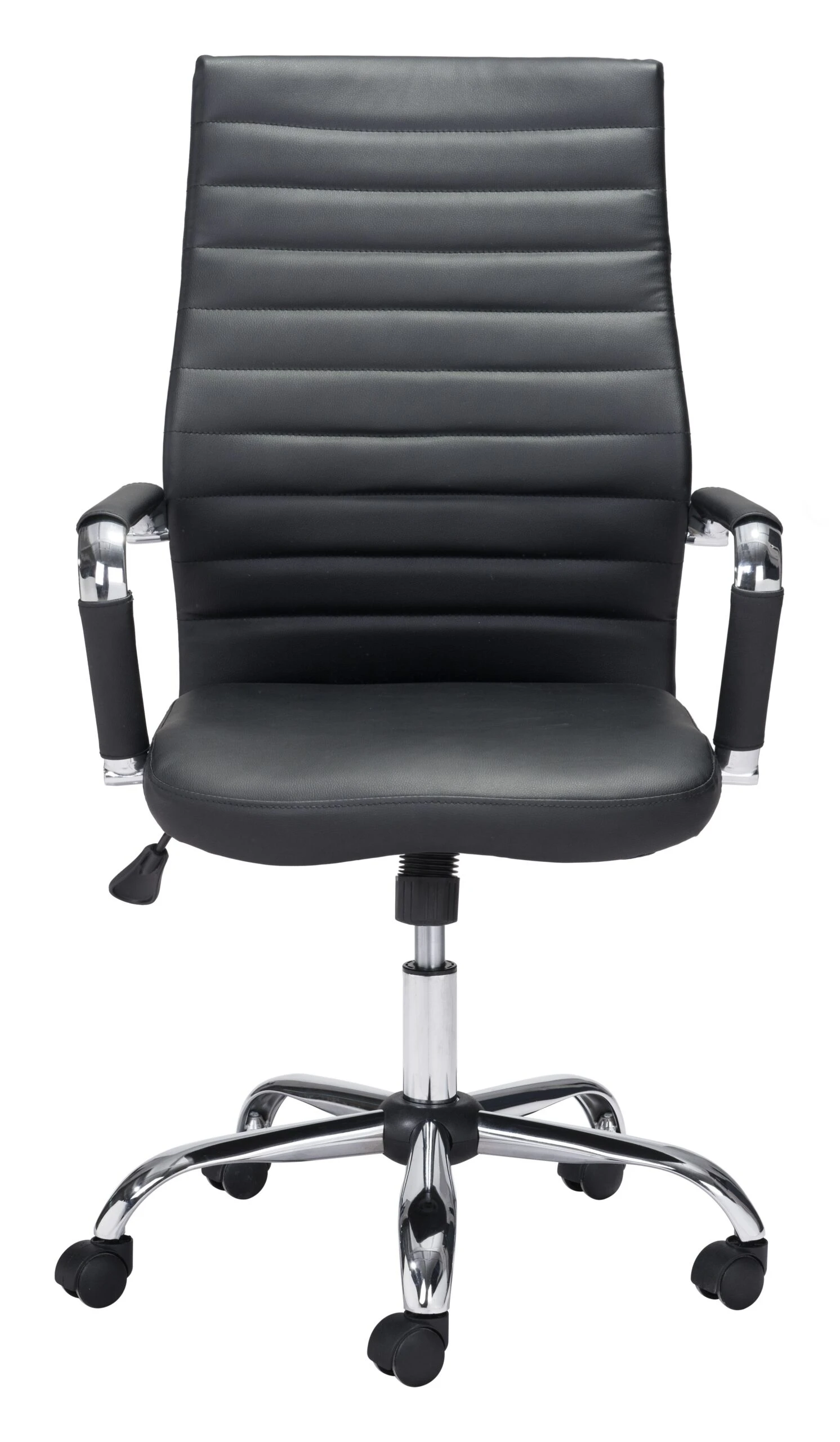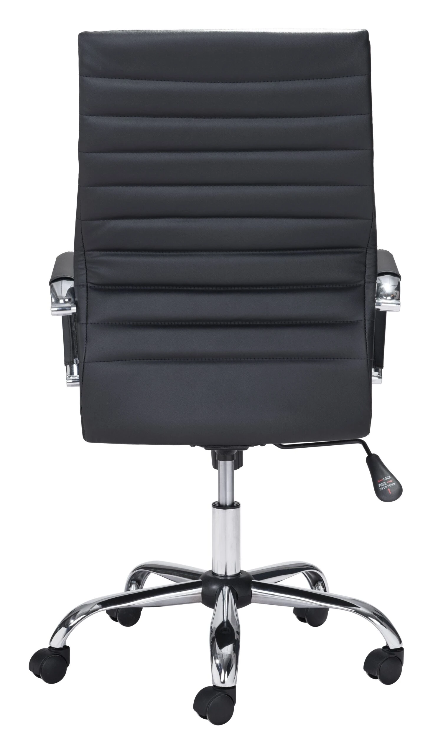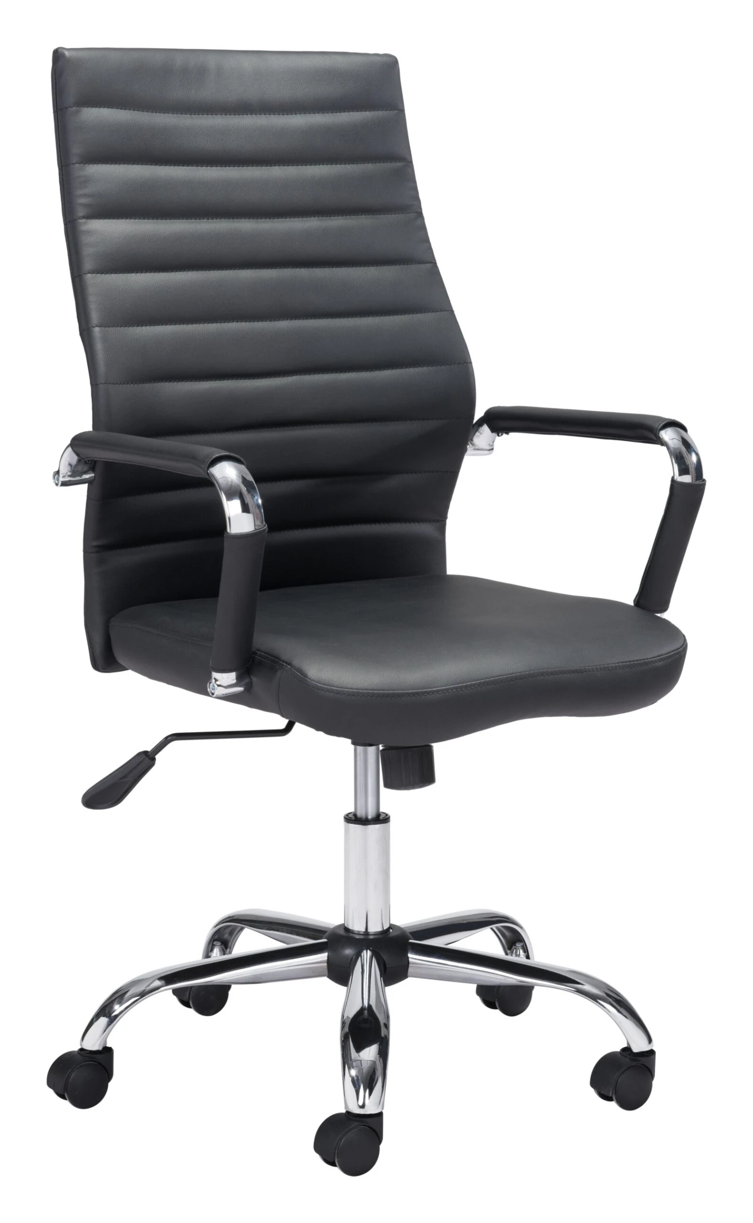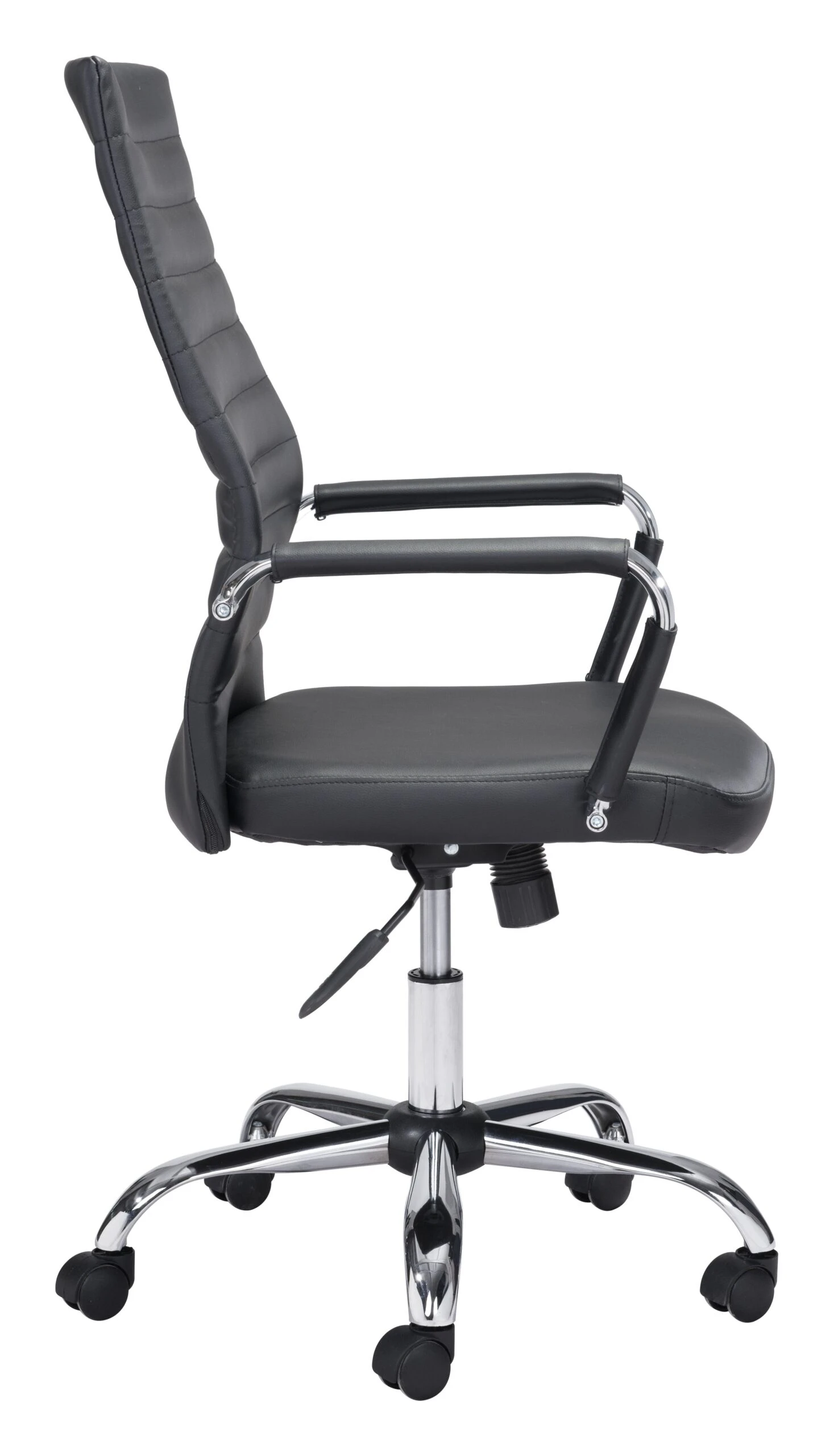 This high back office chair is the answer for professionals seeking both support and classic style. With softness from the leatherette and added convenience from the rolling wheels, you’ll easily glide from your phone to your computer and back. Rest your arms and sit back and relax with this choice. An ideal choice for up to 330 pounds.