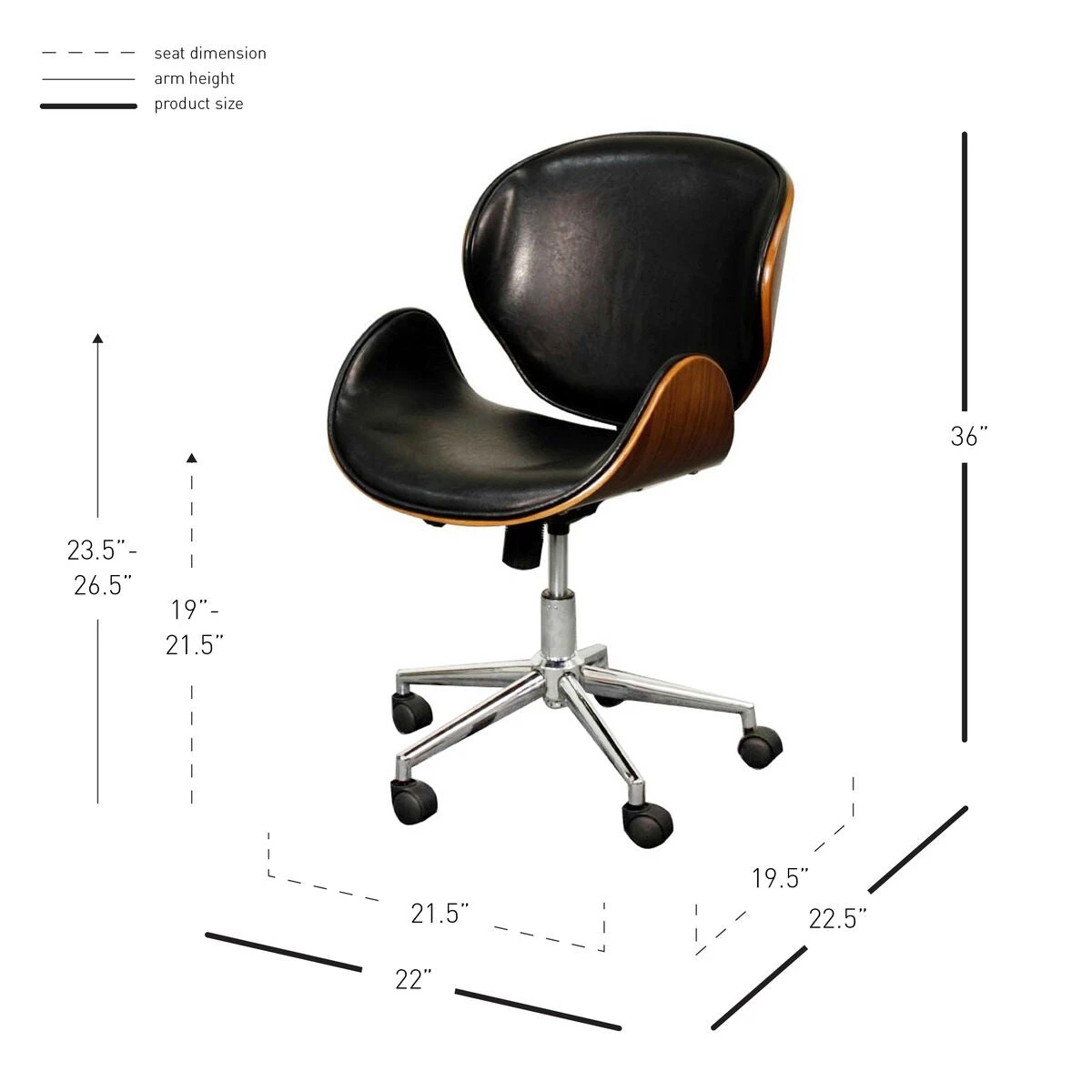 This gorgeous chair features a soft black leatherette encased in an elegant walnut veneer frame. The star base is made from chromed steel. It has wheels, smooth casters, and an adjustable height.Â