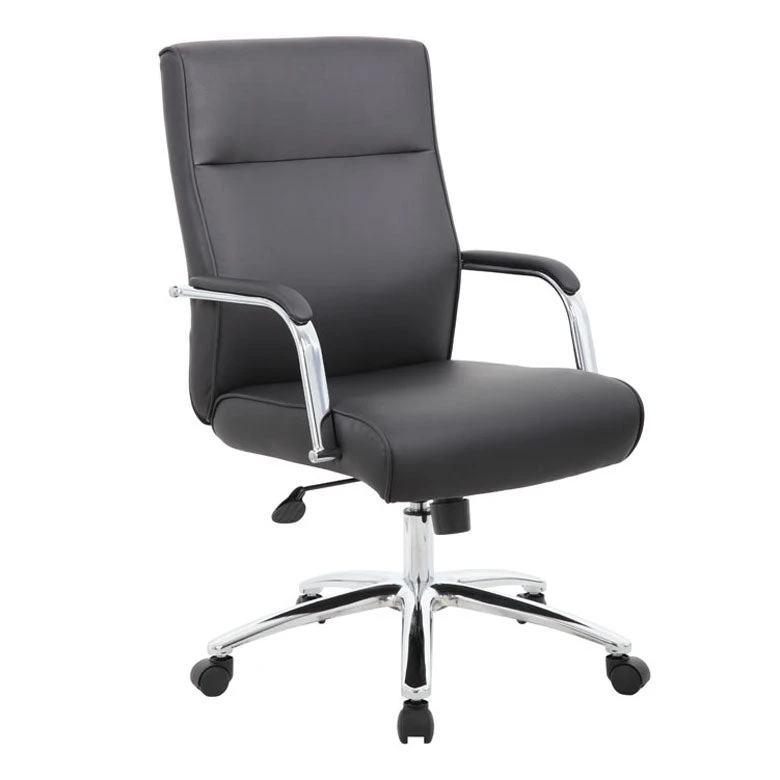Comfort and elegance–this chair has both. It features a soft faux leather upholstery, ergonomic seating, and built-in lumbar support. Find stability in the chrome base, and mobility in the hooded double wheel casters. Spend your workday in comfort and style in this office chair.