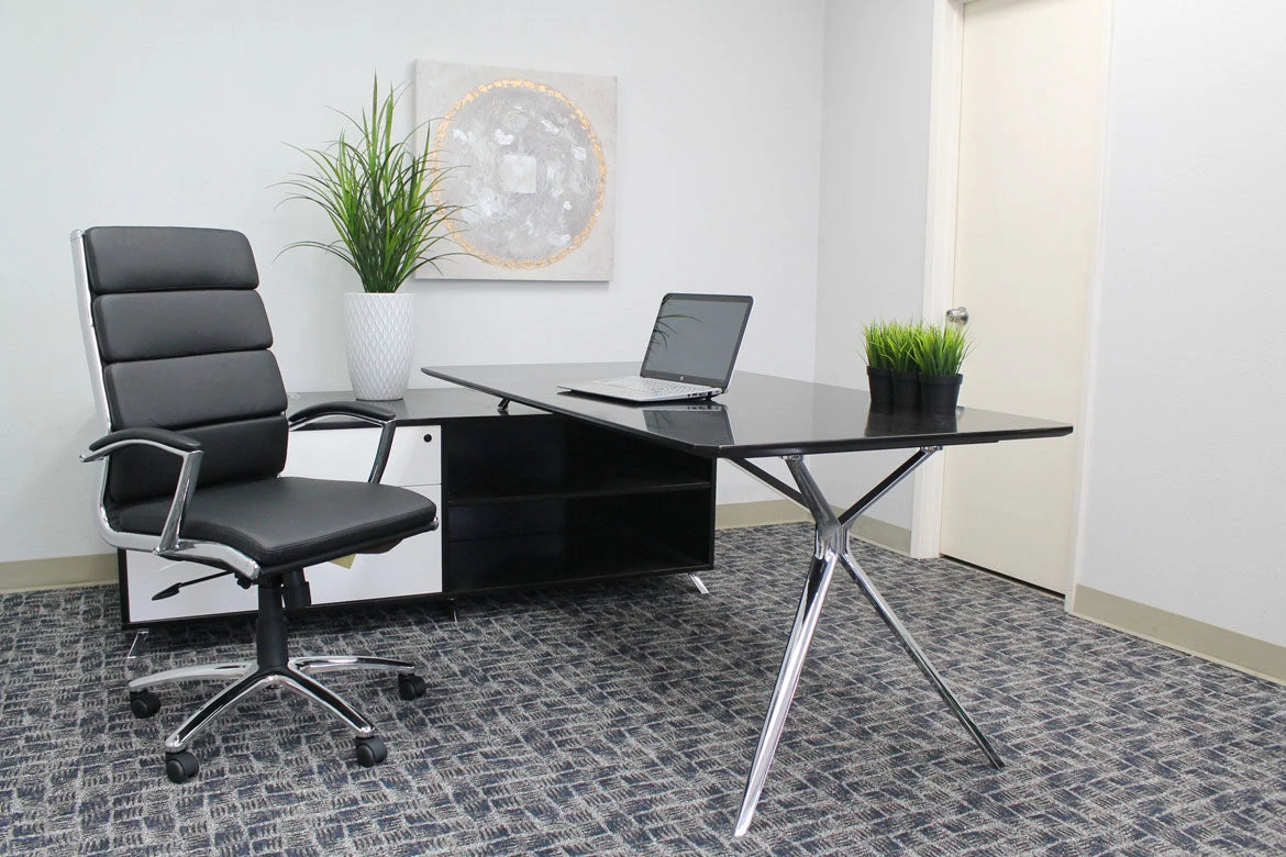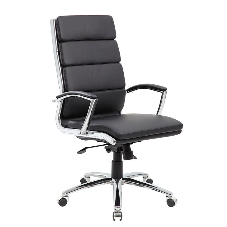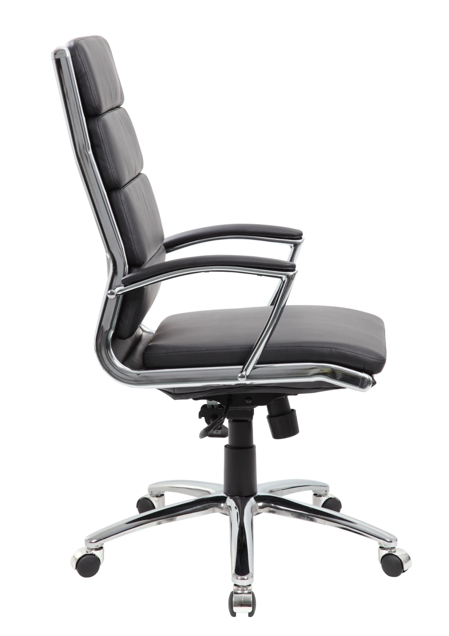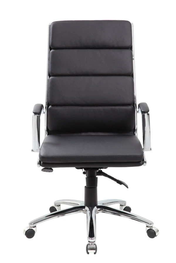 This stylish chair with sleek lines will create an eye-catching silhouette in your modern office. The horizontal lines on the back add grace to the faux leather upholstery, and the padded seat and arms proffer comfort. Adjust the comfort to your own personal preferences with the tilt tension control, pneumatic gas lift, chrome base, and hooded double wheel casters.Â