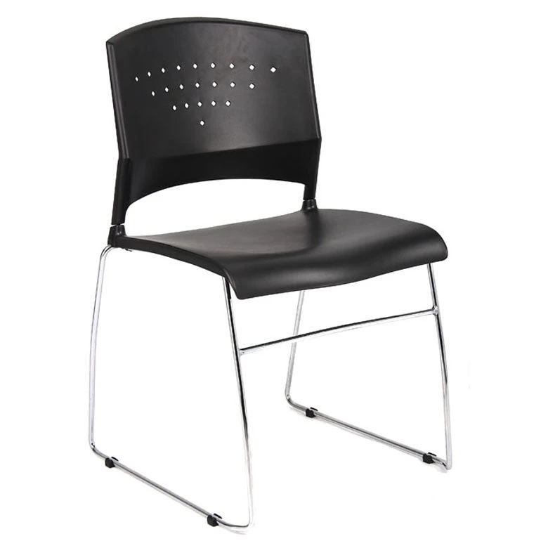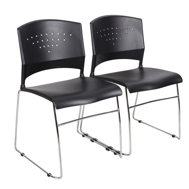 Economical, versatile, and stackable, these chairs are perfect for a variety of uses around the office. Store them away in a closet, or use for extra guests, seating in your waiting area, or in your conference room. They feature a black polypropylene back and seat, and a sturdy chrome frame. These chairs boast superior durability and lumbar support. Can be stacked up to 16 high. This item comes as a set of two.Â