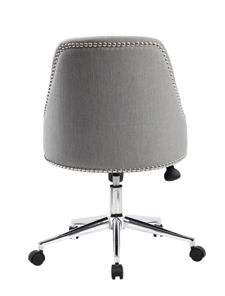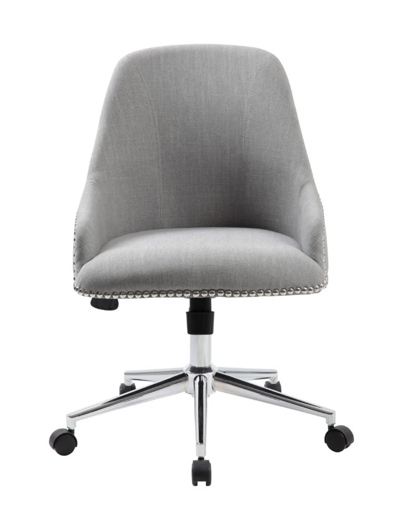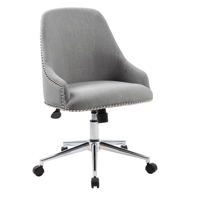This stylish chair offers a superb combination of functionality with a striking visual experience. The linen upholstery is soft and comfortable, and the silver nail-head trim adds a glamorous sparkle to the chair. This is a fantastic option to spruce up your office; you can use either as a desk chair, in your conference room, or as a guest chair. It has a chrome star base with hooded double wheel casters, adjustable tilt and tension control, and a pneumatic gas lift to raise and lower the height.Â