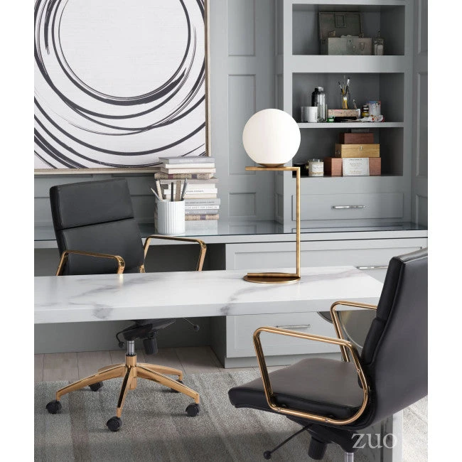Add elegance and style to your modern office space with this beautiful desk lamp. It features a single-legged minimalist design with an orb balanced on the top. It is made of steel with a brushed brass finish.