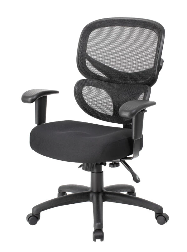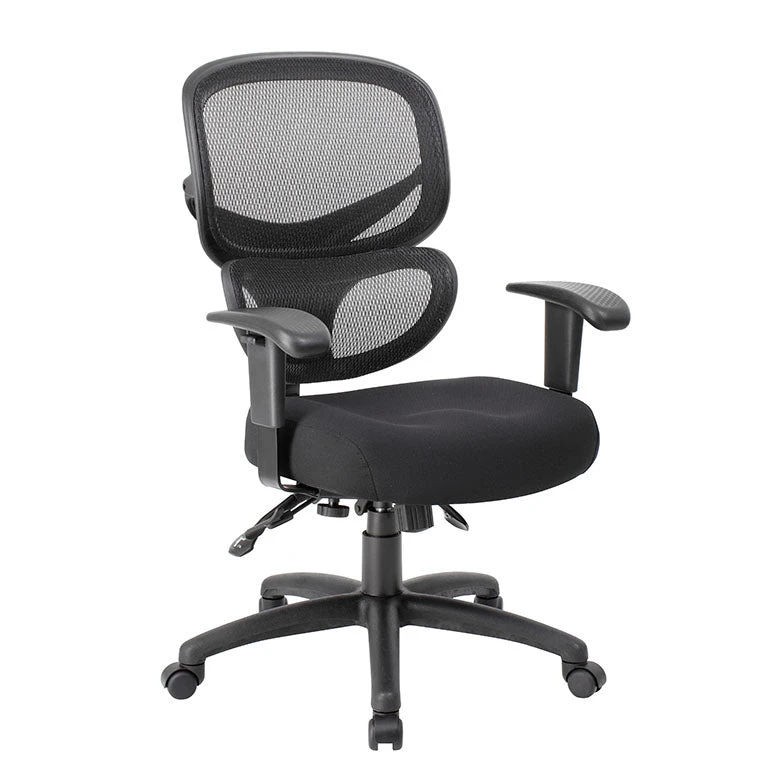 Comfort, stability, and ease all come with this classic black office chair. It features a mesh back with sturdy supports, arm rests, and a comfortable padded seat. It has a ratchet back and active lumbar support, and you can adjust the height, width, and arms. It comes with a tilting mechanism as well.