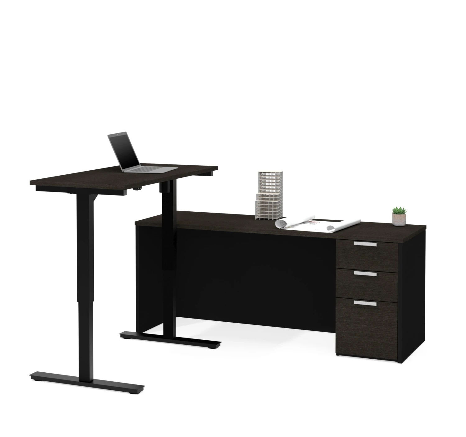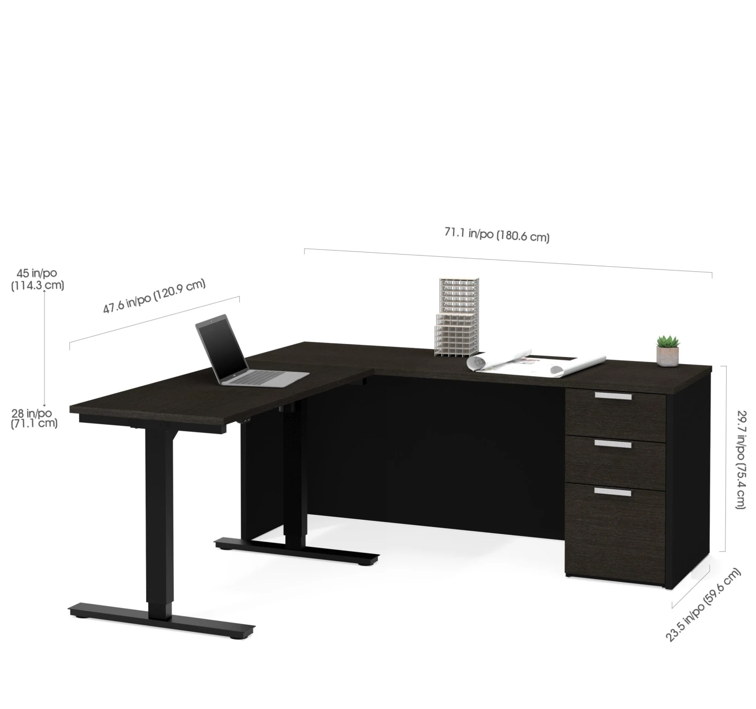 The desk’s dimensions (as pictured) are 71.1″ W X 71.1″ D X 29.7″ H. The height adjustable portion goes from 28-45″ in height. The dimensions of the optional matching lateral file are 28″ W X 19.5″ D X 30″ H.