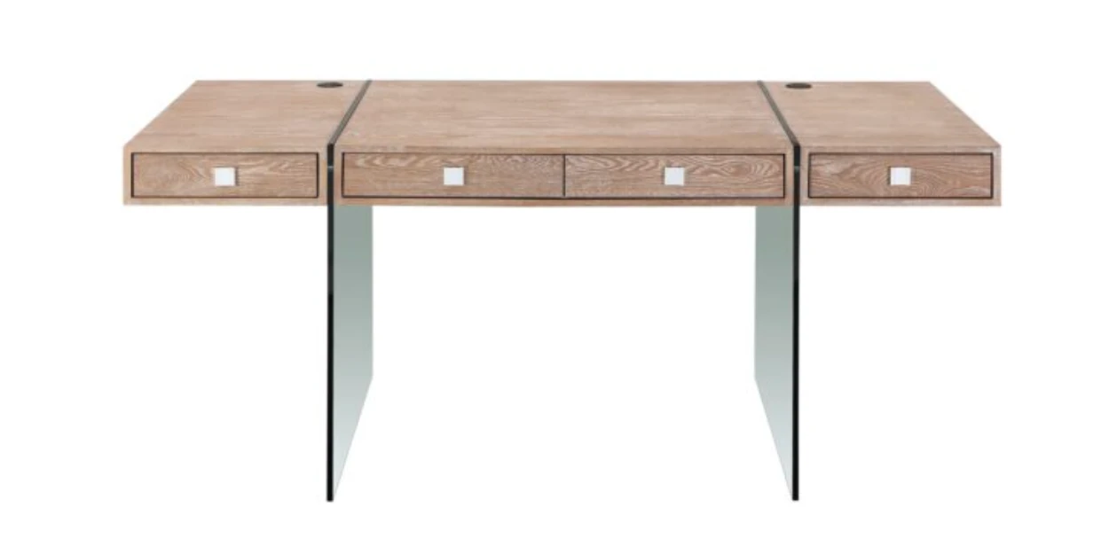 This beautiful desk from Sharelle offers two extra thick tempered glass legs for a unique and elegant look, and a stylish walnut top with beautiful woodgrain and attractive hardware.ย Its four drawers will provide ample space for your office accessories, and its two wire management holes will enable you to keep your desk top totally cord free.ย The roomy desk top will give you all the space you need to spread out and work, and if you need more space for files or general storage, add on the optional matching credenza, which includes four more drawers, a large cabinet, and two file drawers.