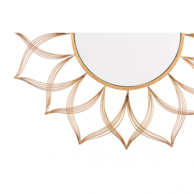Add a cheerful peek at the outdoors with this beautiful mirror, designed withย the shape of flower petals. The petals that flesh out the frame are made from gold wire, and the clear glass in the center will add light to your conference room, office, or waiting area.